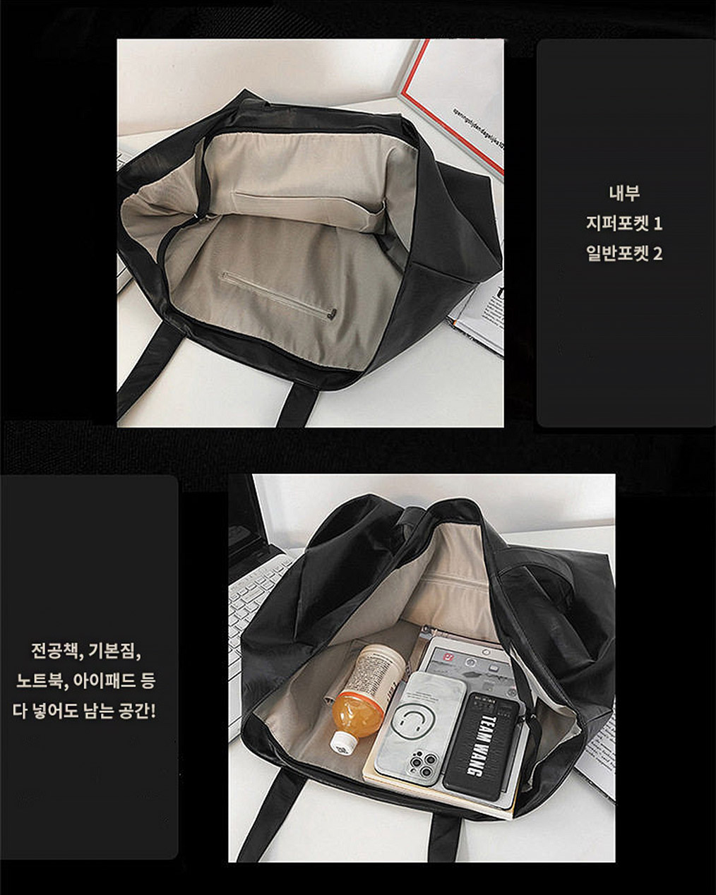 - 노트북, 태블릿, 전공 책까지 여유 있게 들어가는 대용량 사이즈로 데일리부터 여행·출근·등하교까지 활용도 높음.