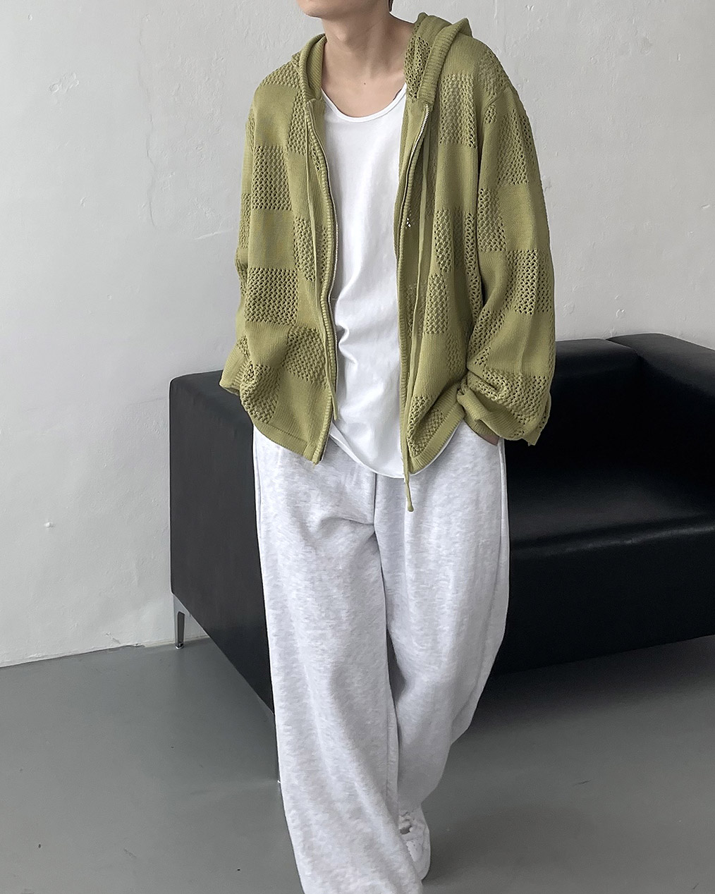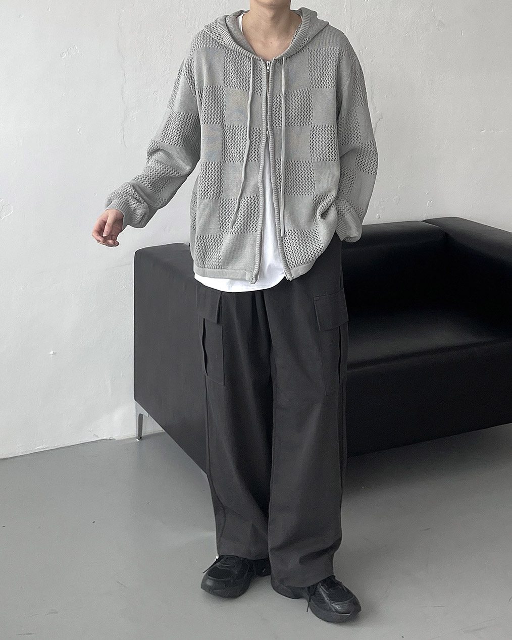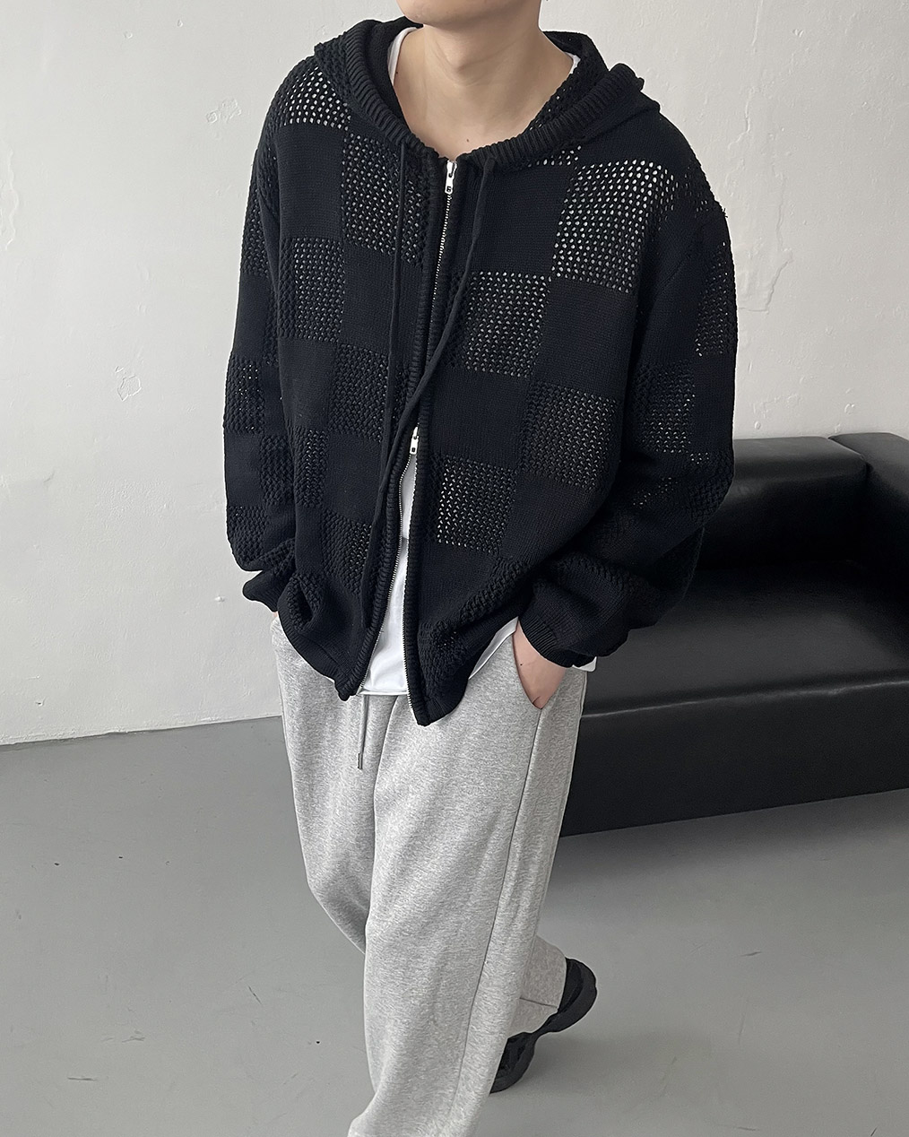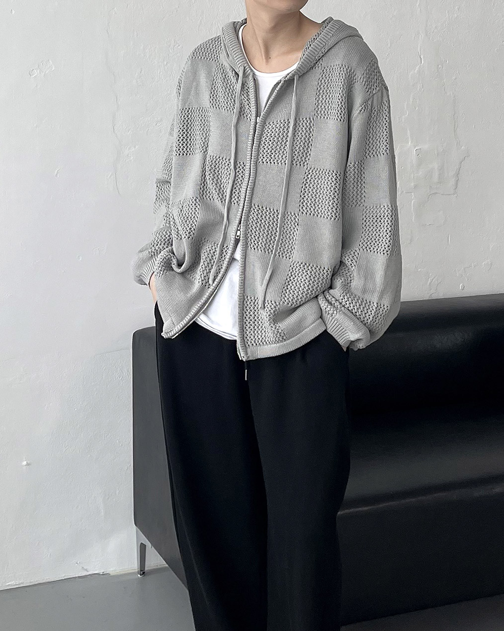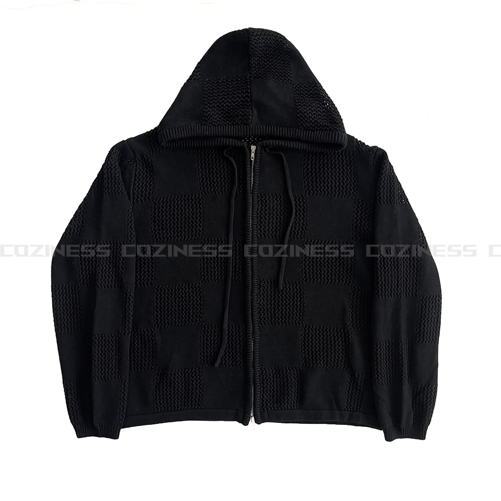 - 체커보드 패턴에 펀칭이 더해진 니트 후드 집업