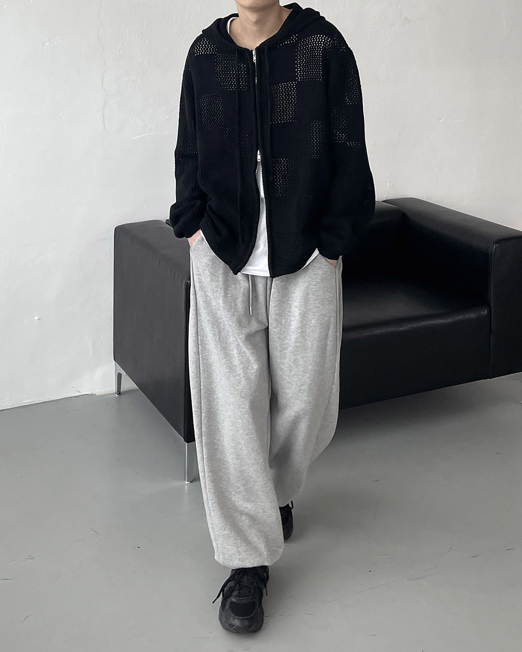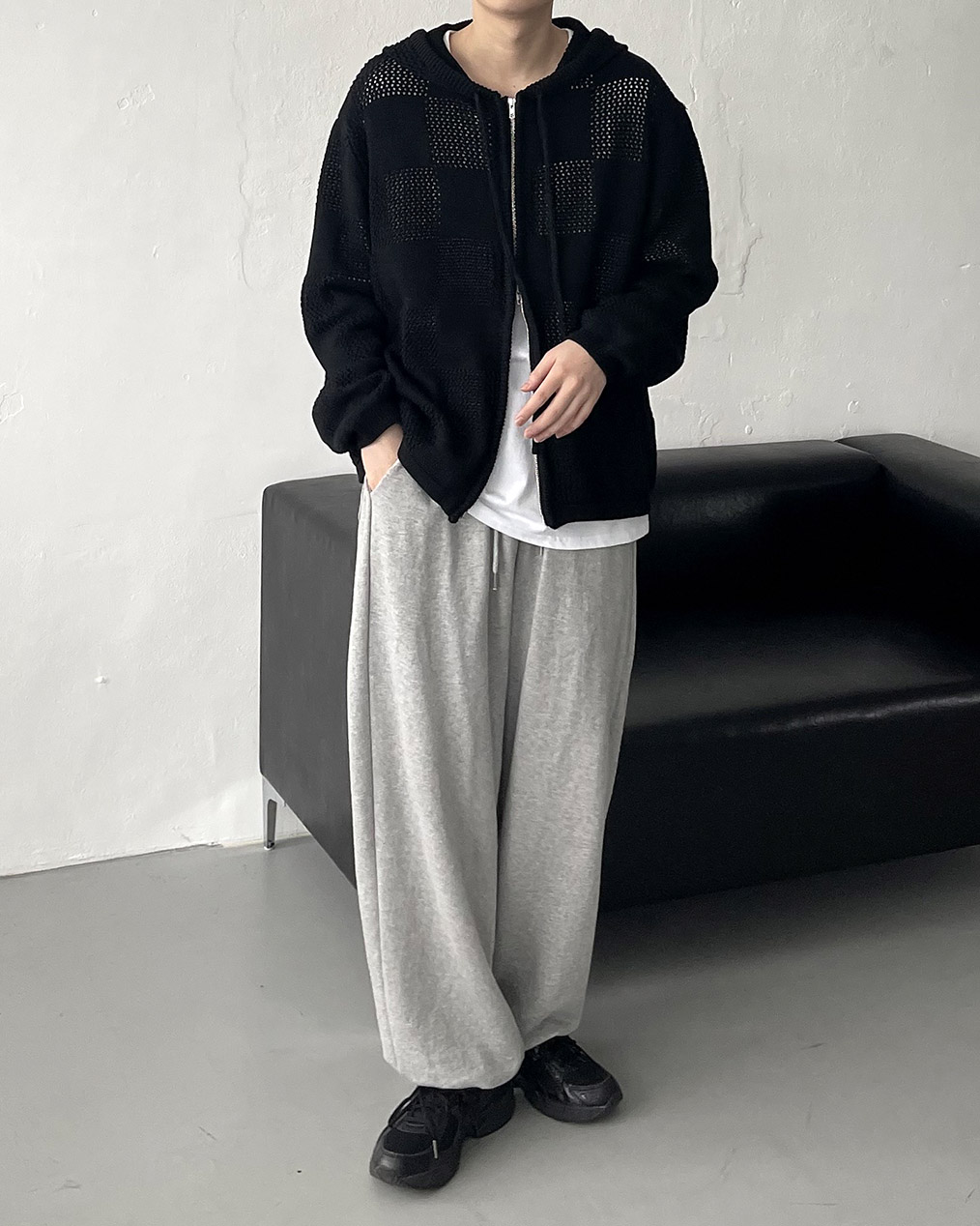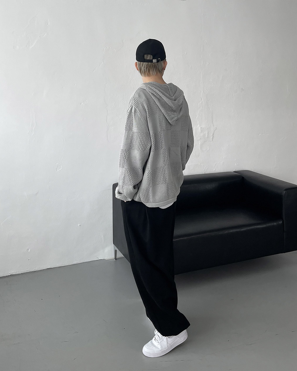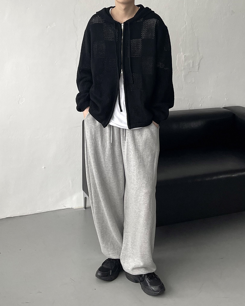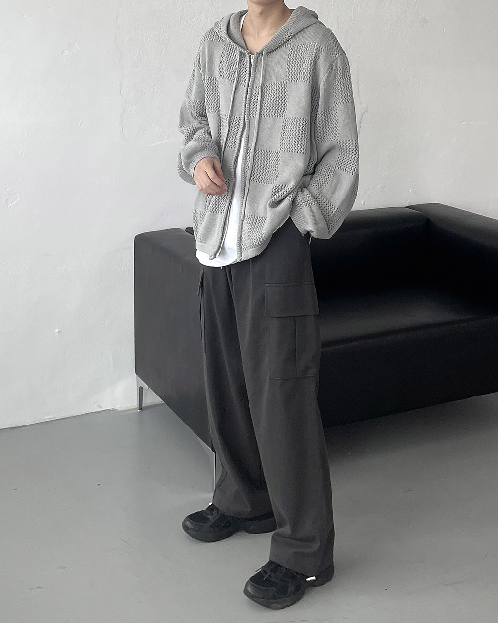 - 체커보드 패턴에 펀칭이 더해진 니트 후드 집업