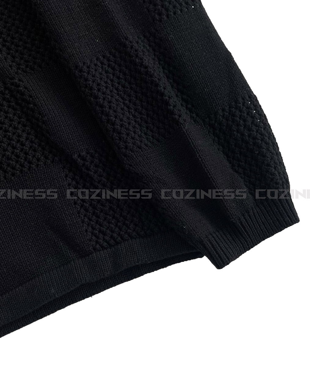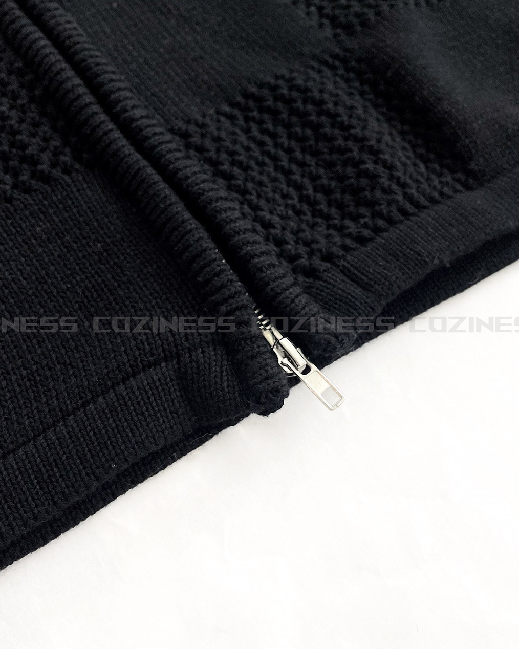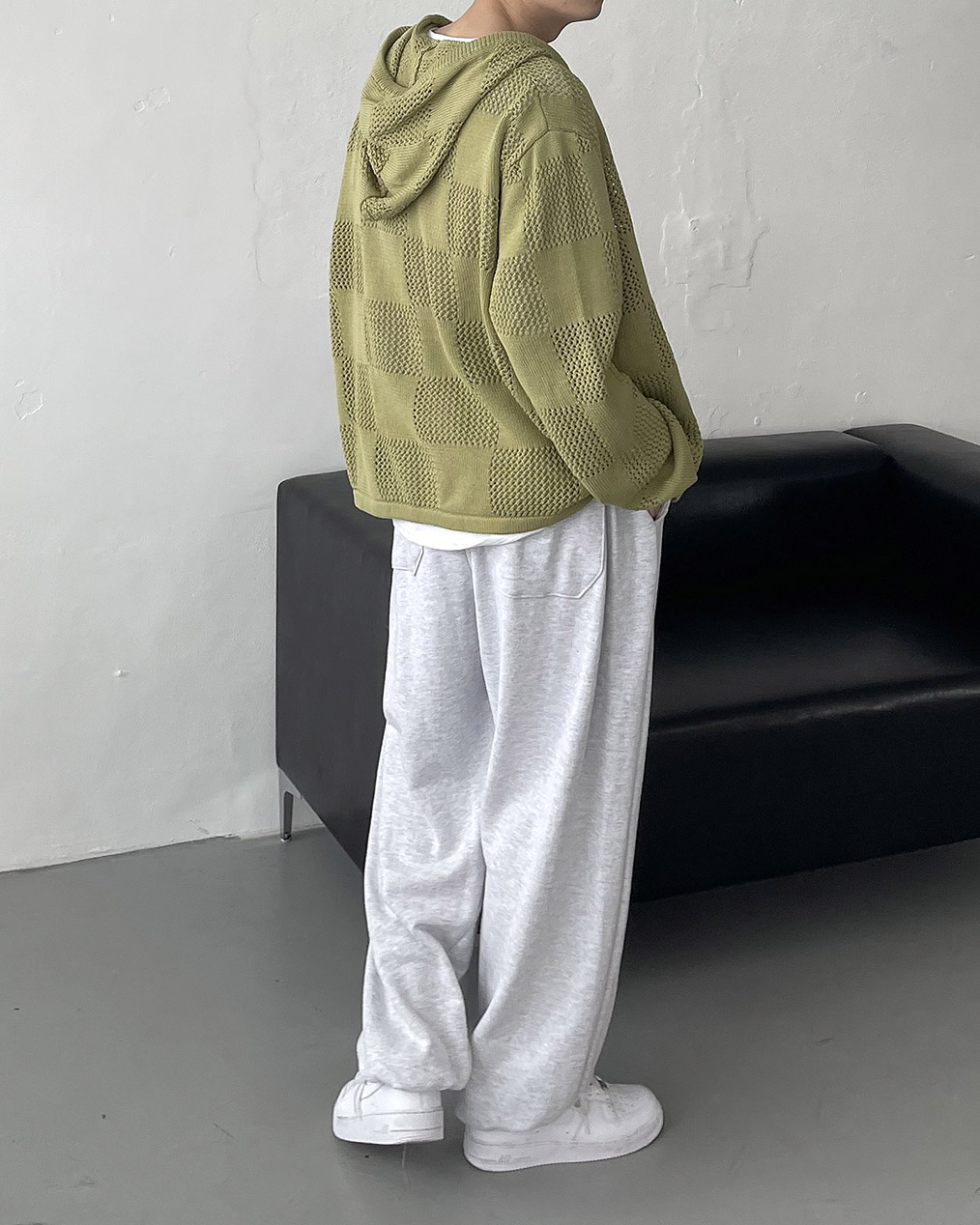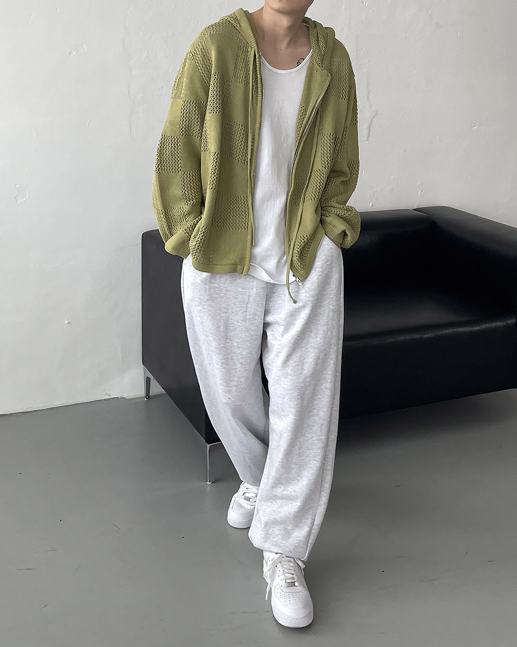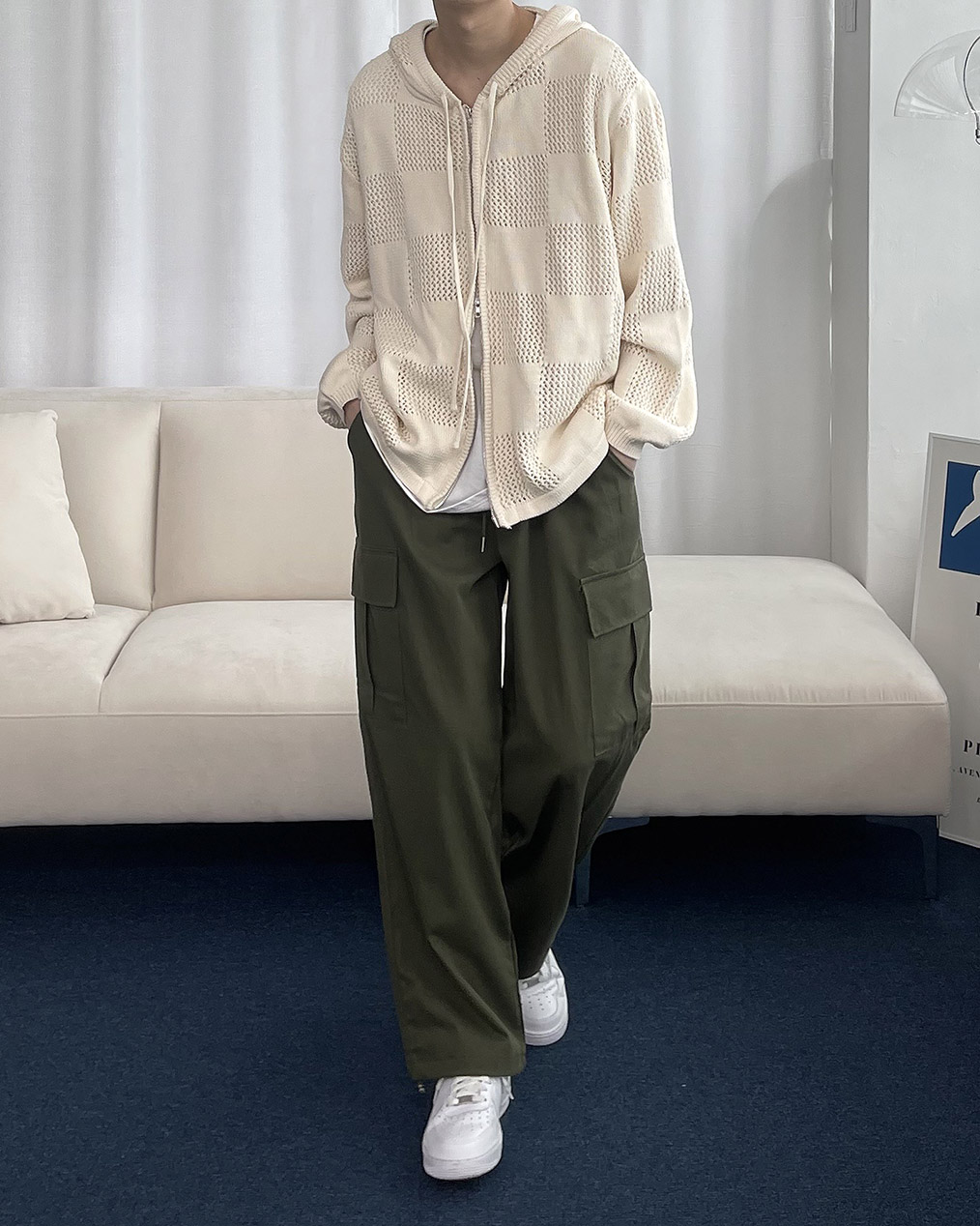- 체커보드 패턴에 펀칭이 더해진 니트 후드 집업