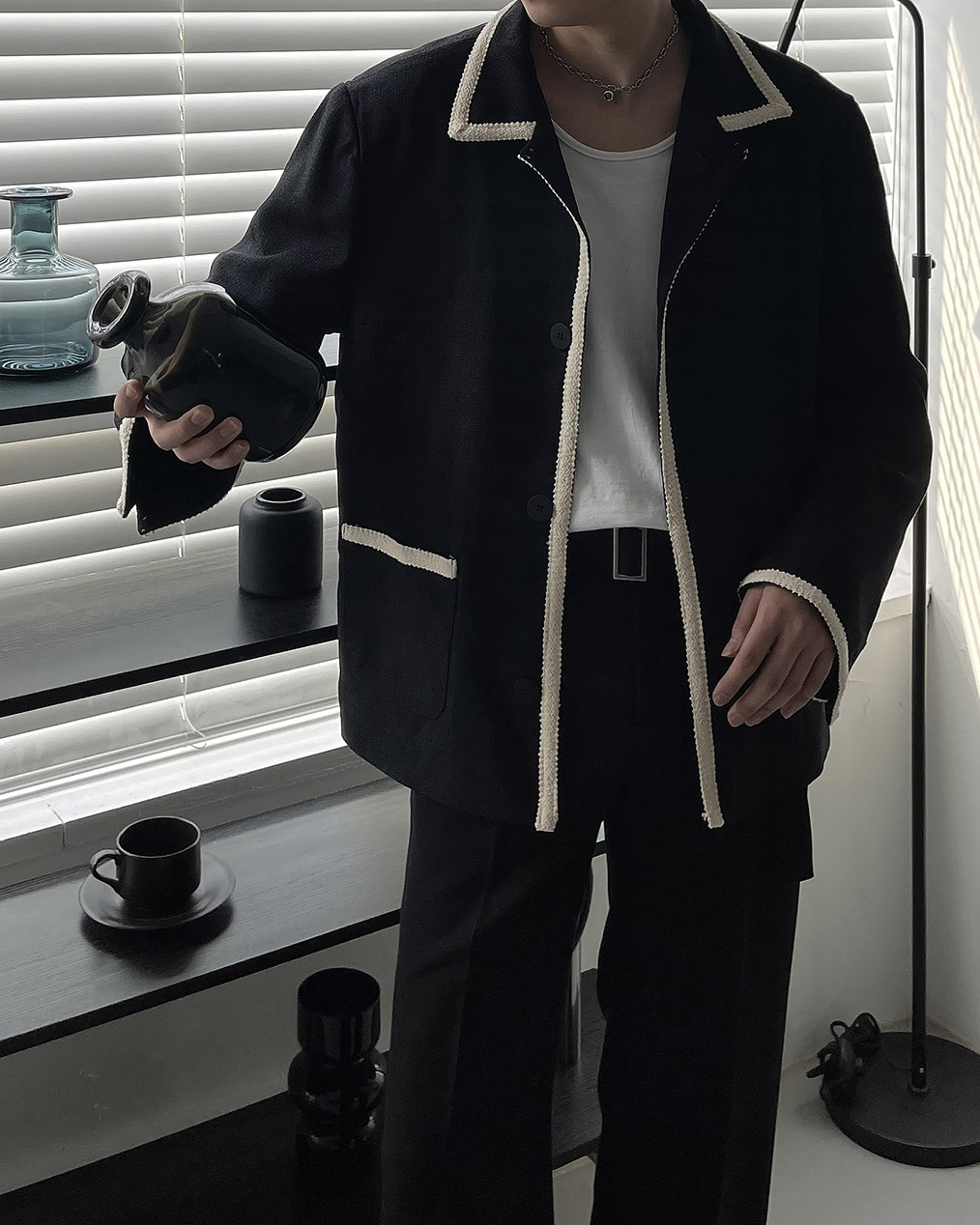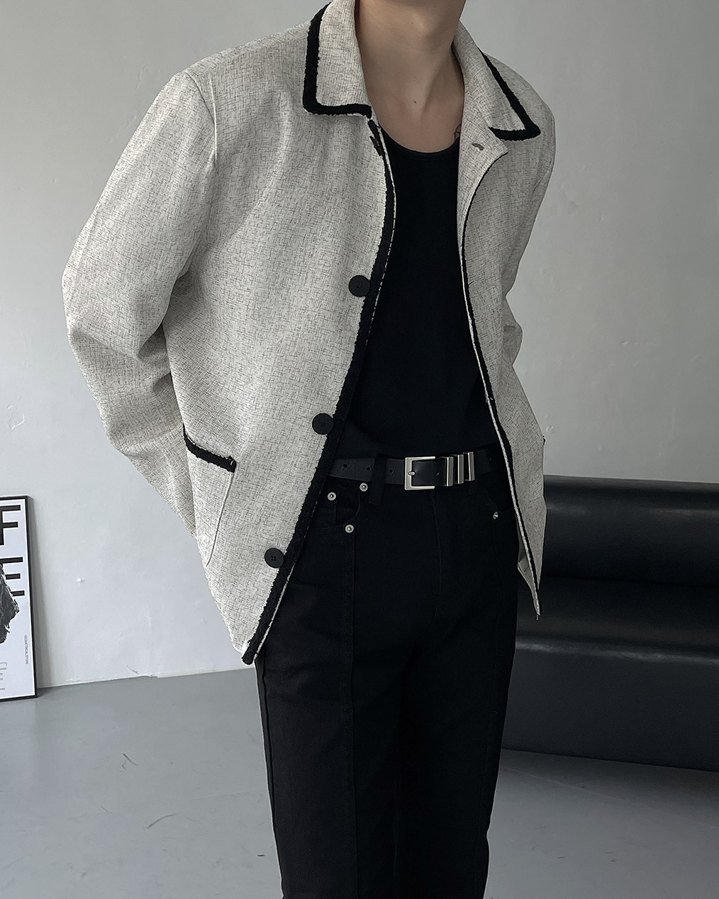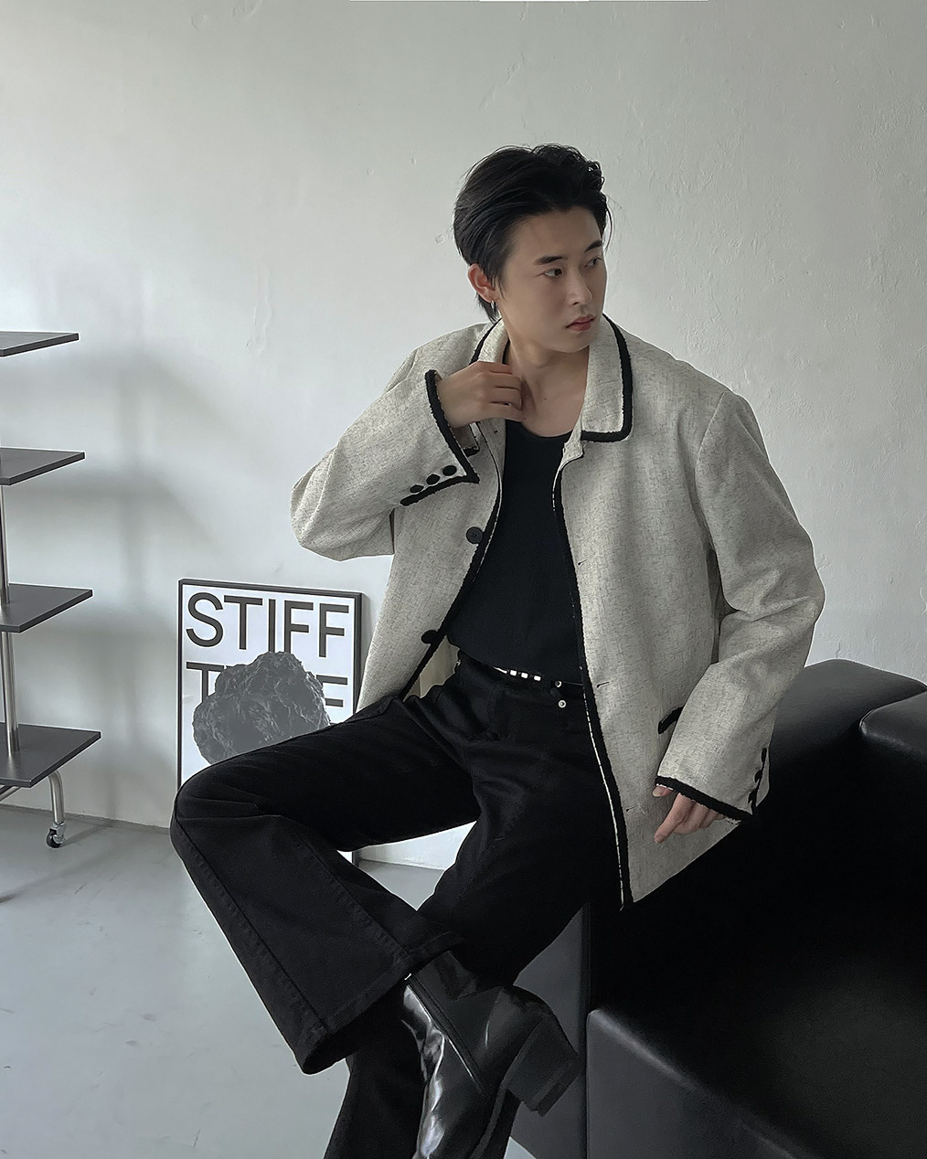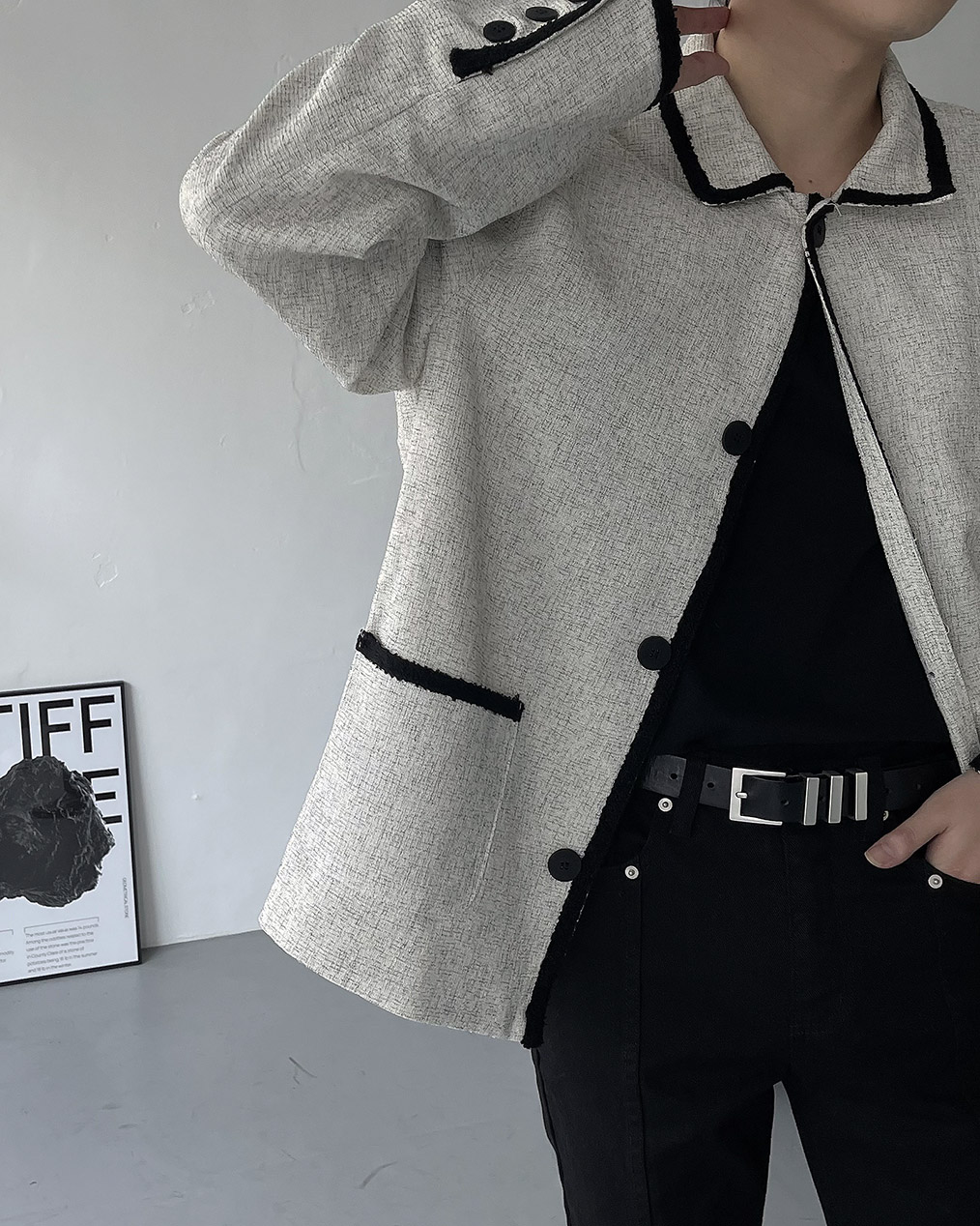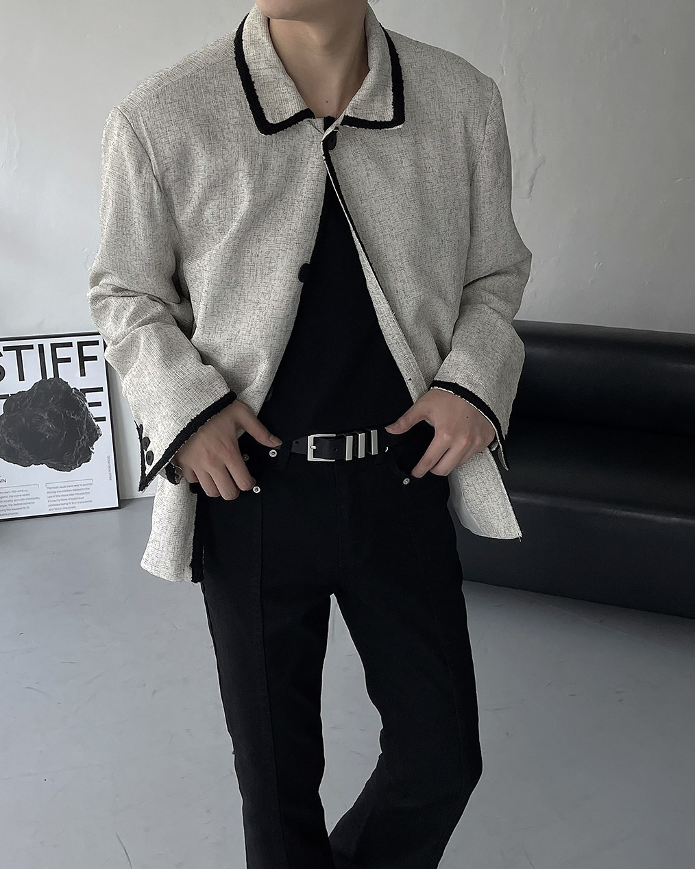 - 부분 라인 배색 디테일이 돋보이는 카라 트위드 자켓