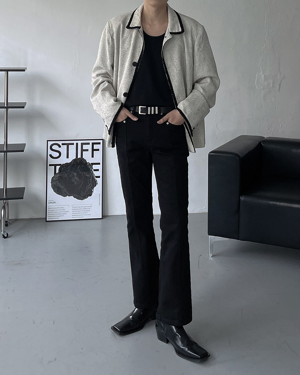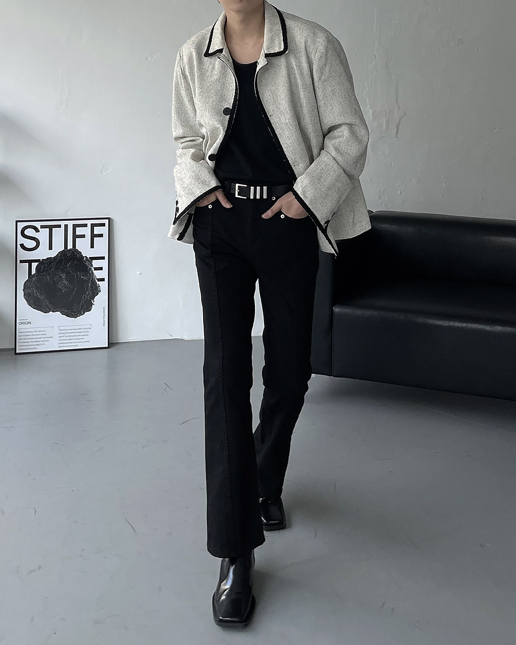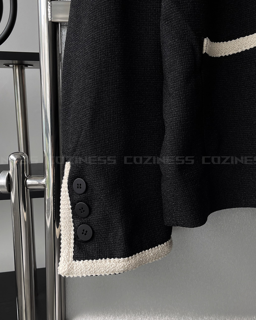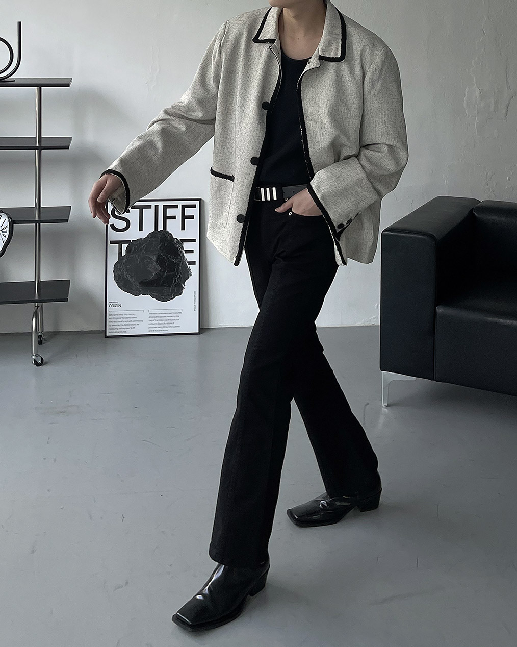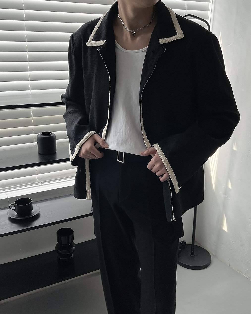 - 부분 라인 배색 디테일이 돋보이는 카라 트위드 자켓