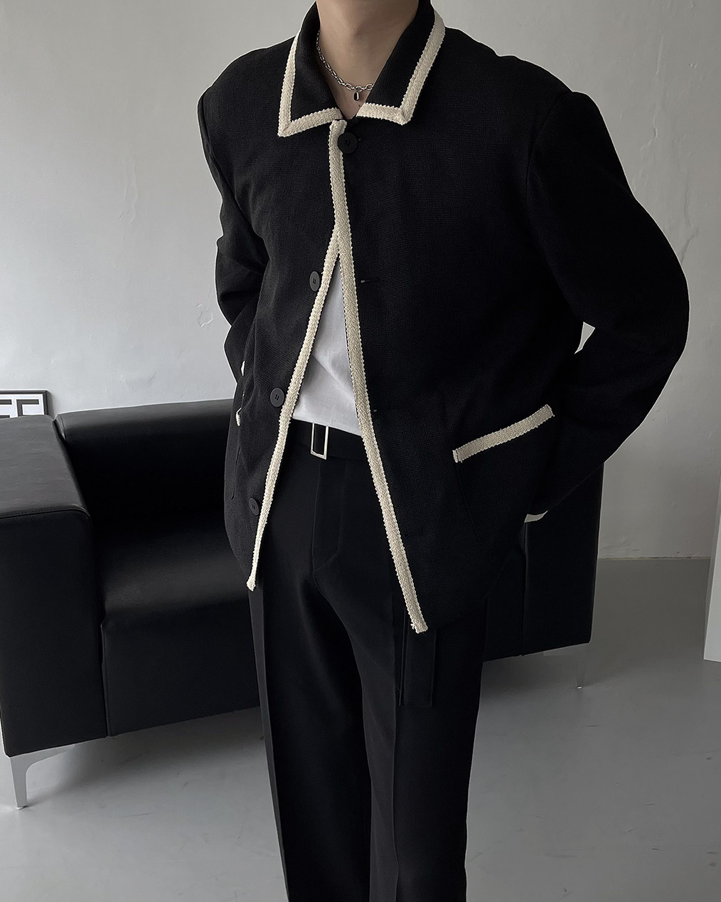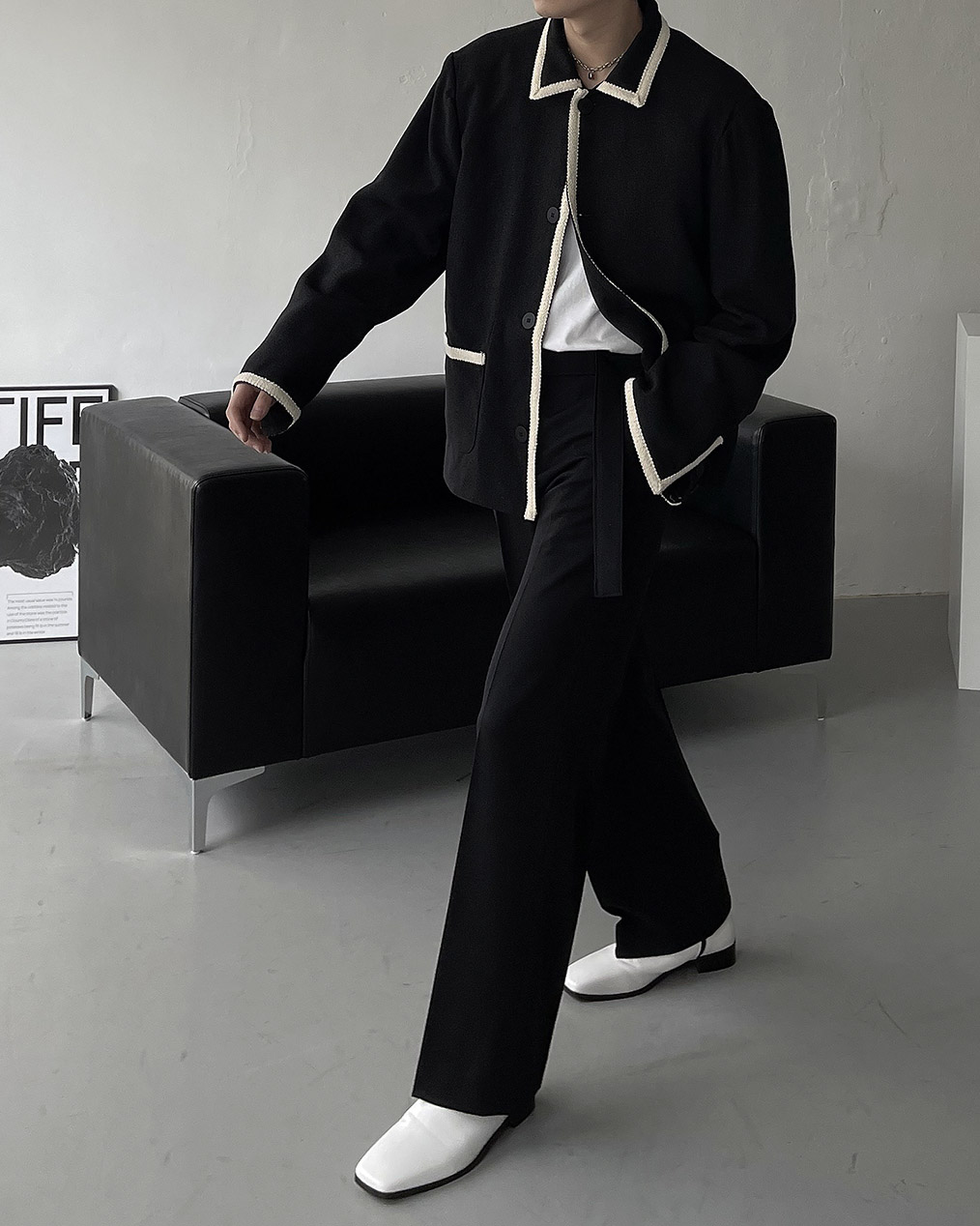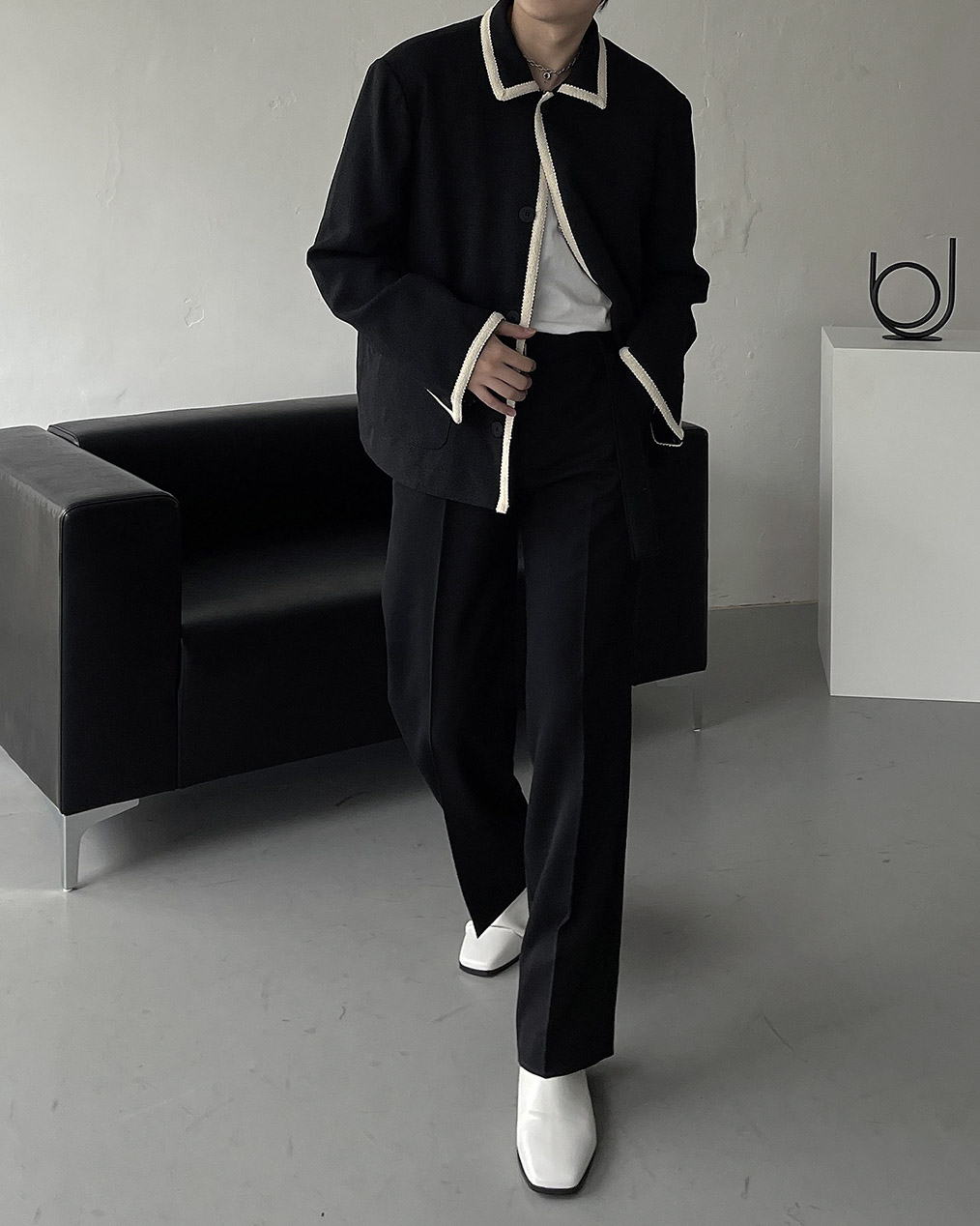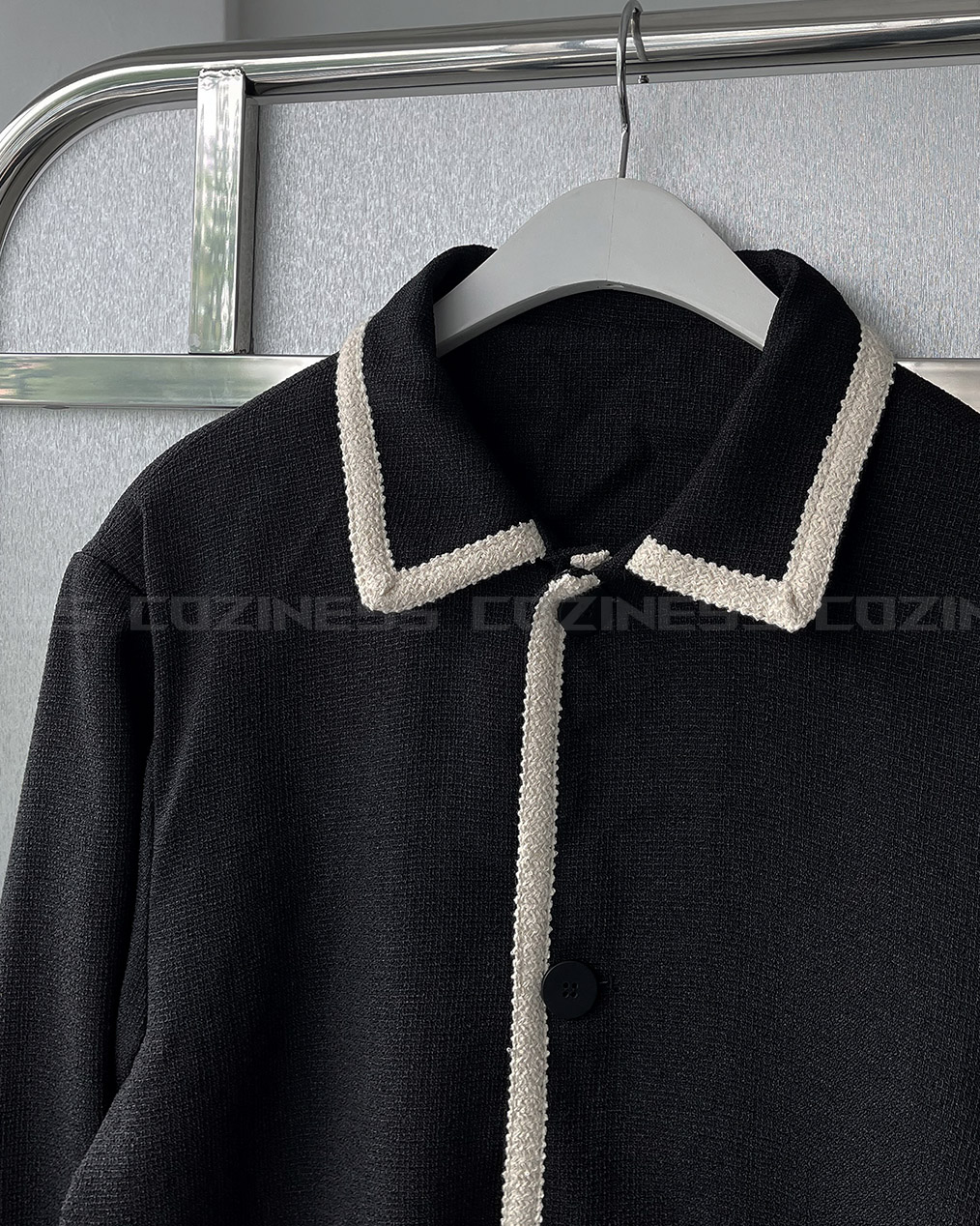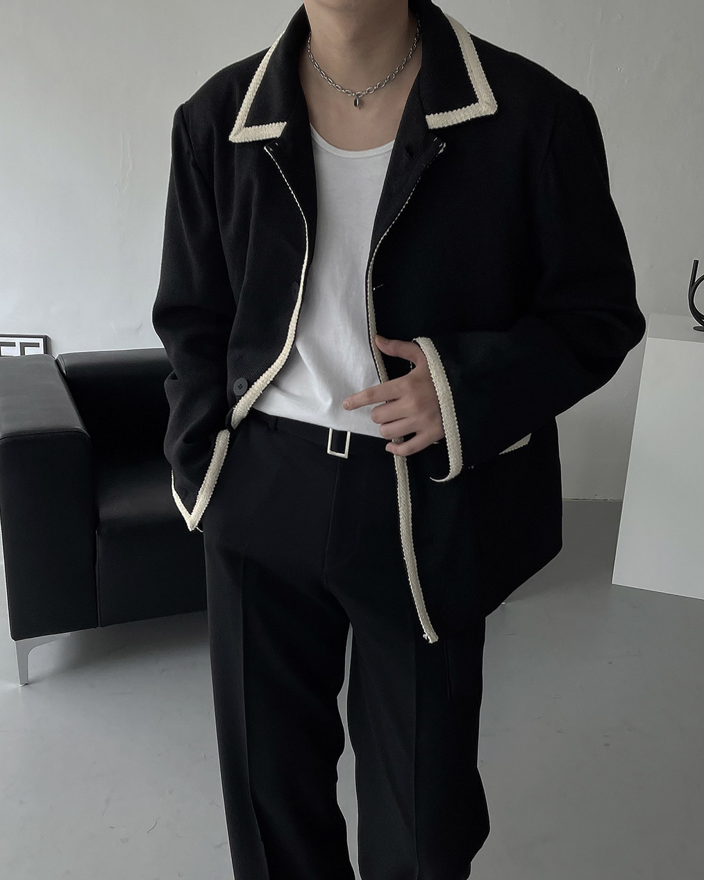 - 부분 라인 배색 디테일이 돋보이는 카라 트위드 자켓