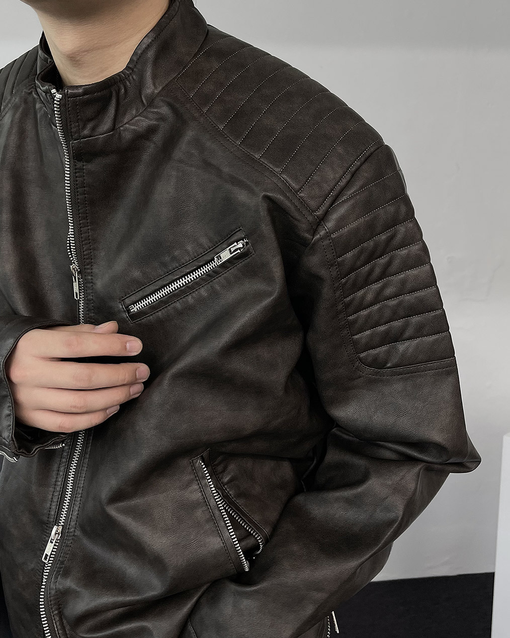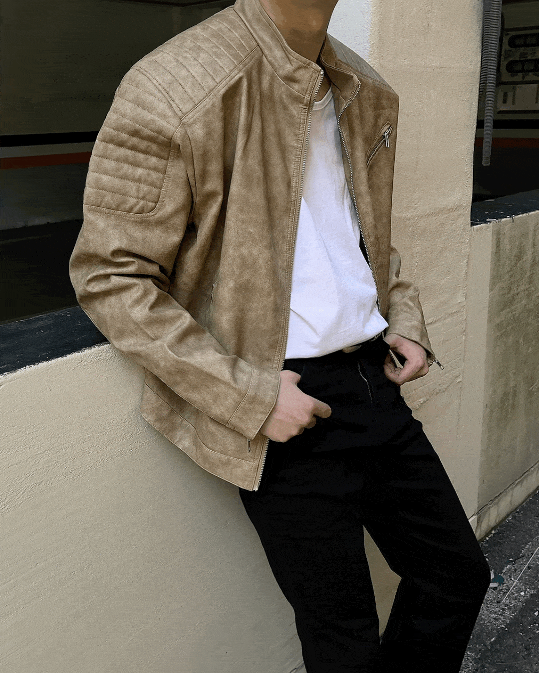- 싱글 라이더 베이스 디자인에 패드 디테일이 돋보이는 레더 자켓