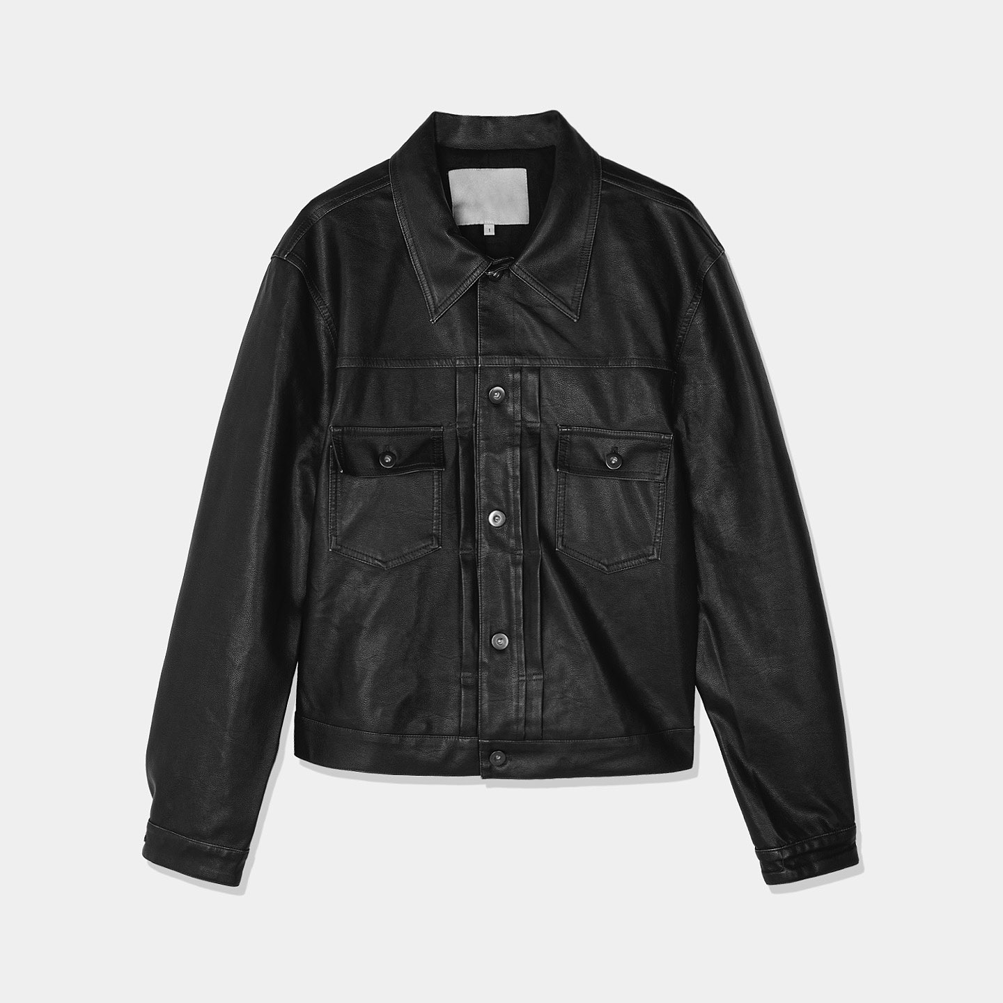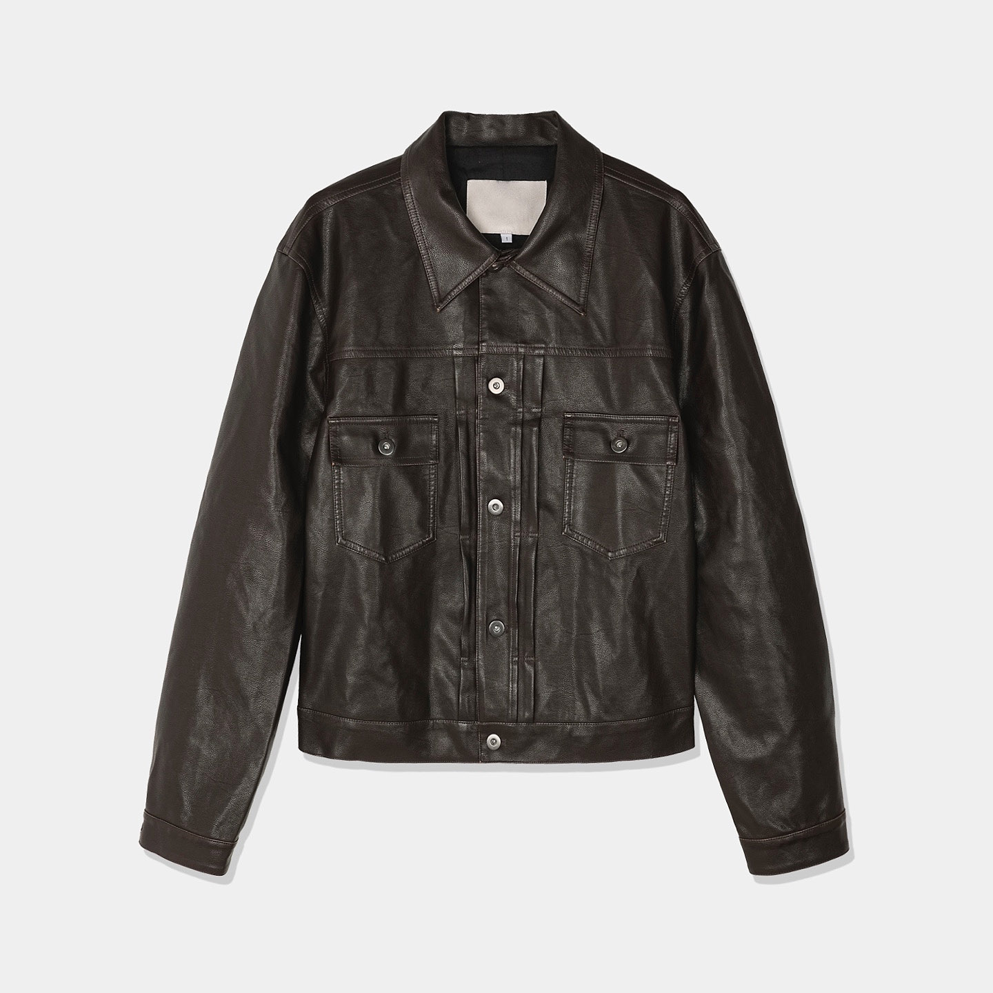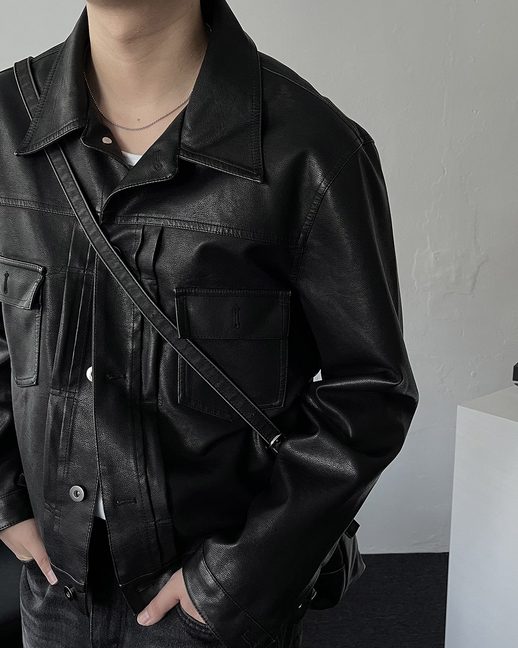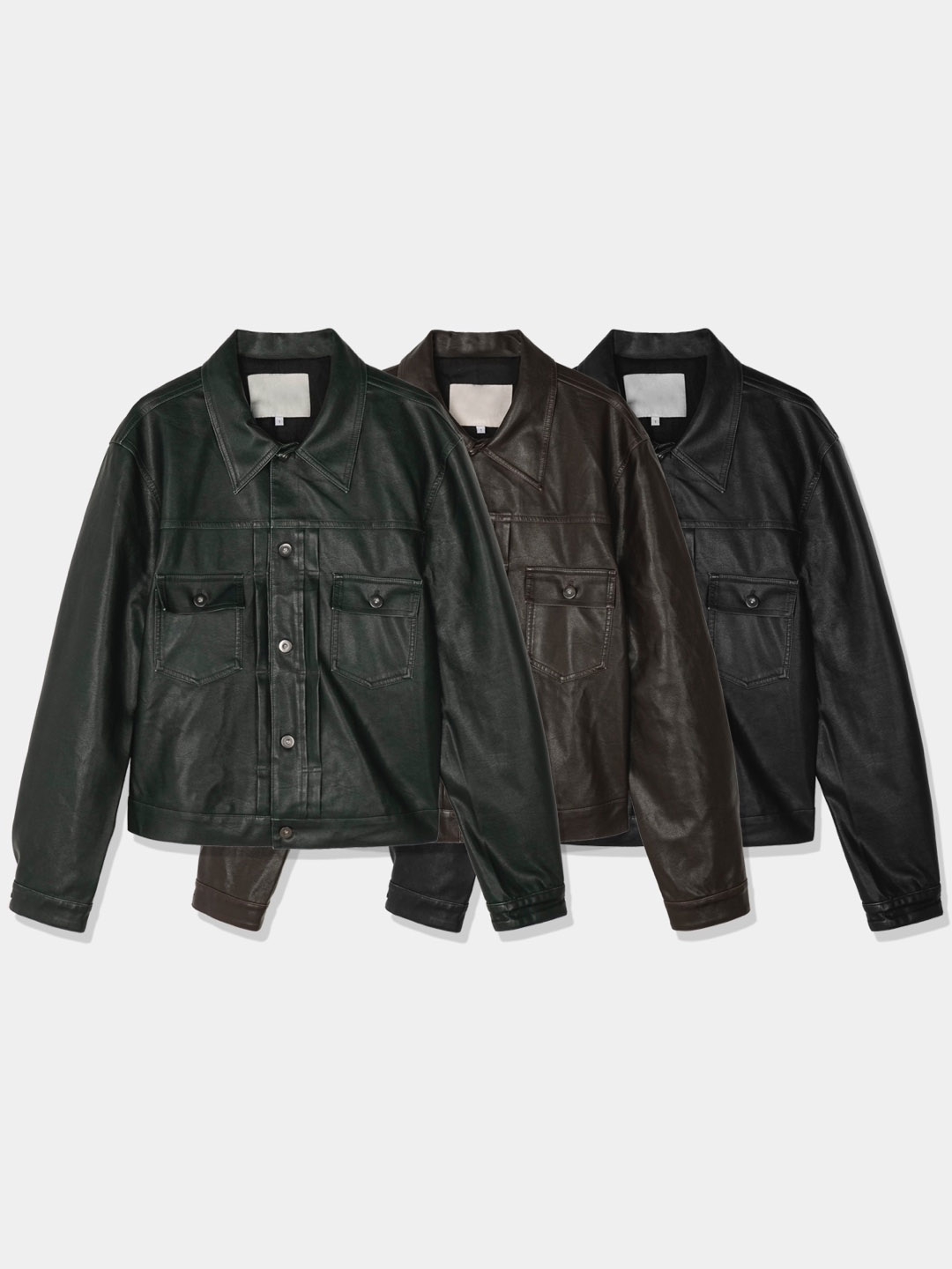 - 트랜디한 핏과 톤 다운된 컬러가 매력적인 레더 트러커 자켓