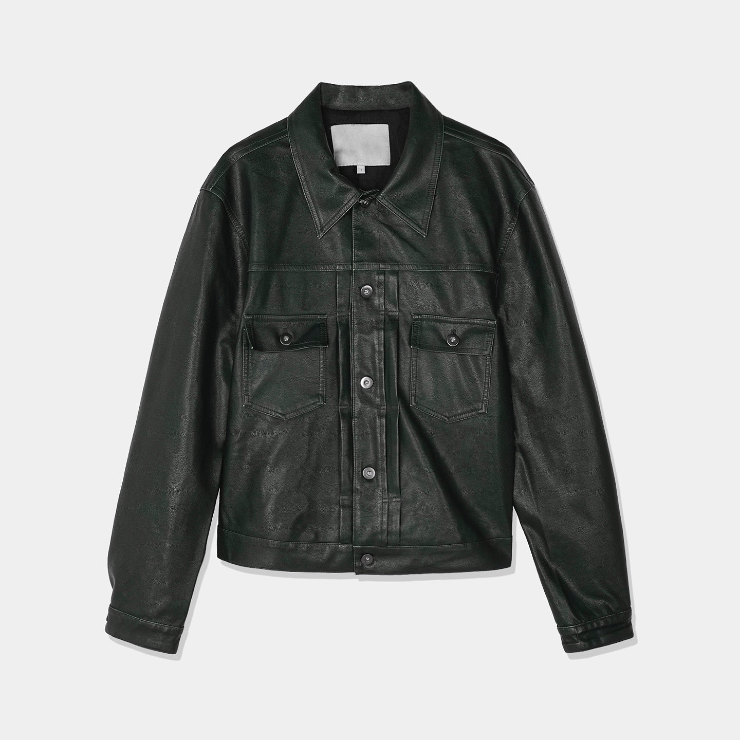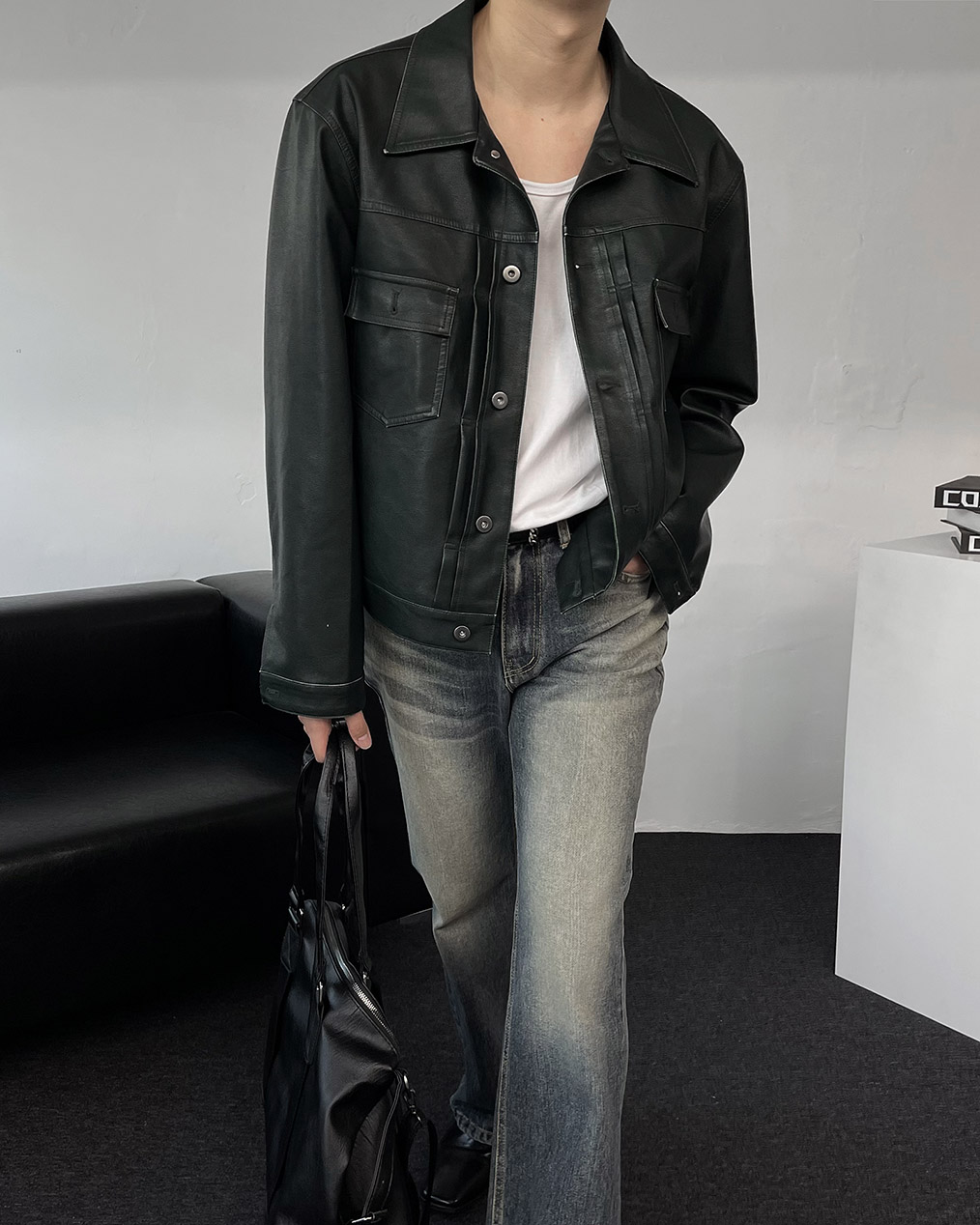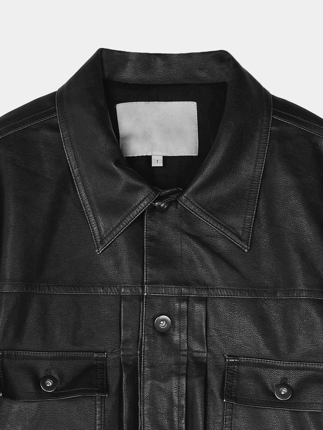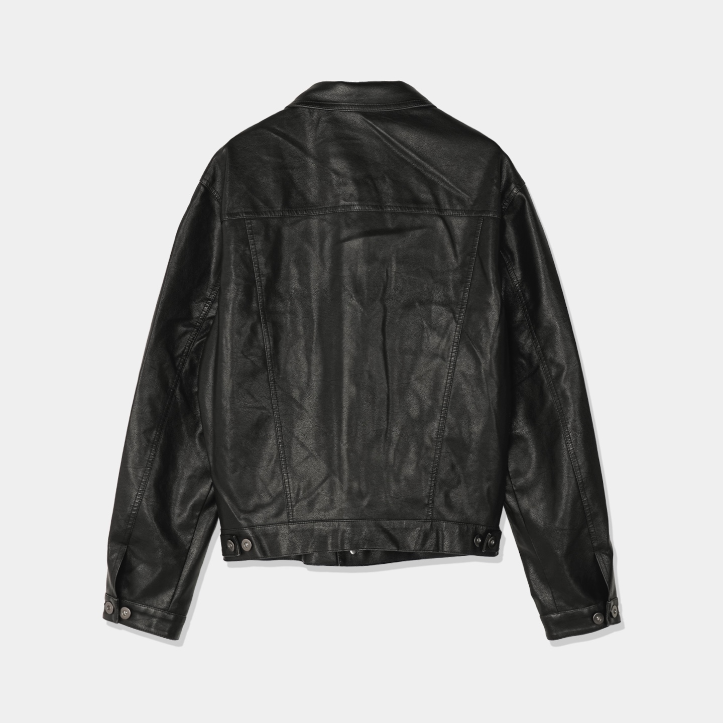 - 트랜디한 핏과 톤 다운된 컬러가 매력적인 레더 트러커 자켓