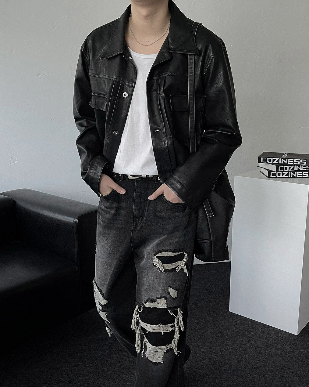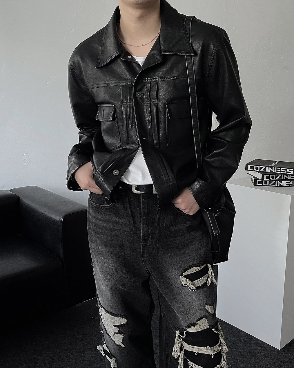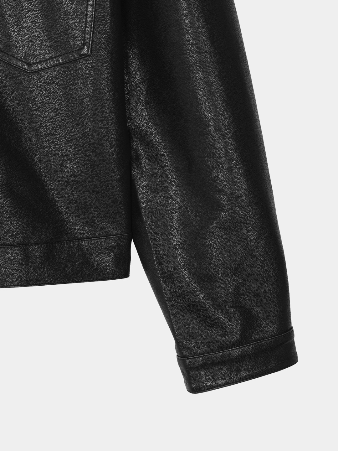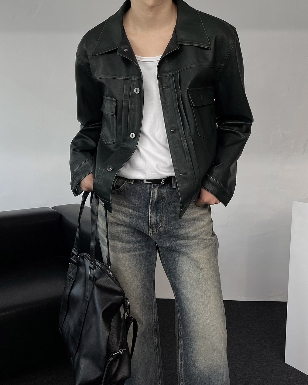 - 트랜디한 핏과 톤 다운된 컬러가 매력적인 레더 트러커 자켓