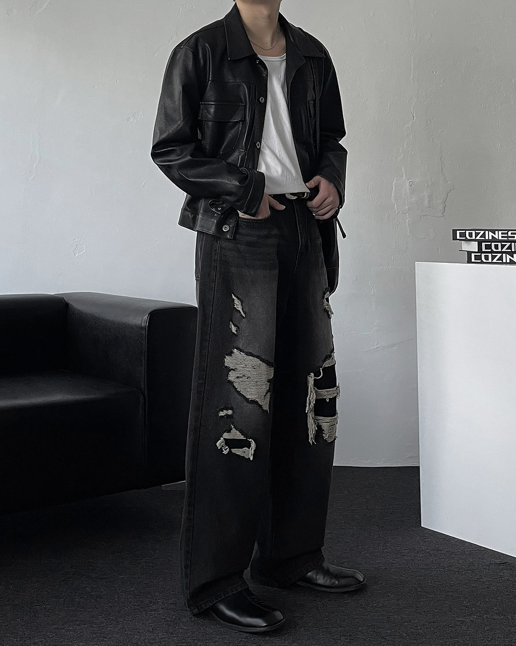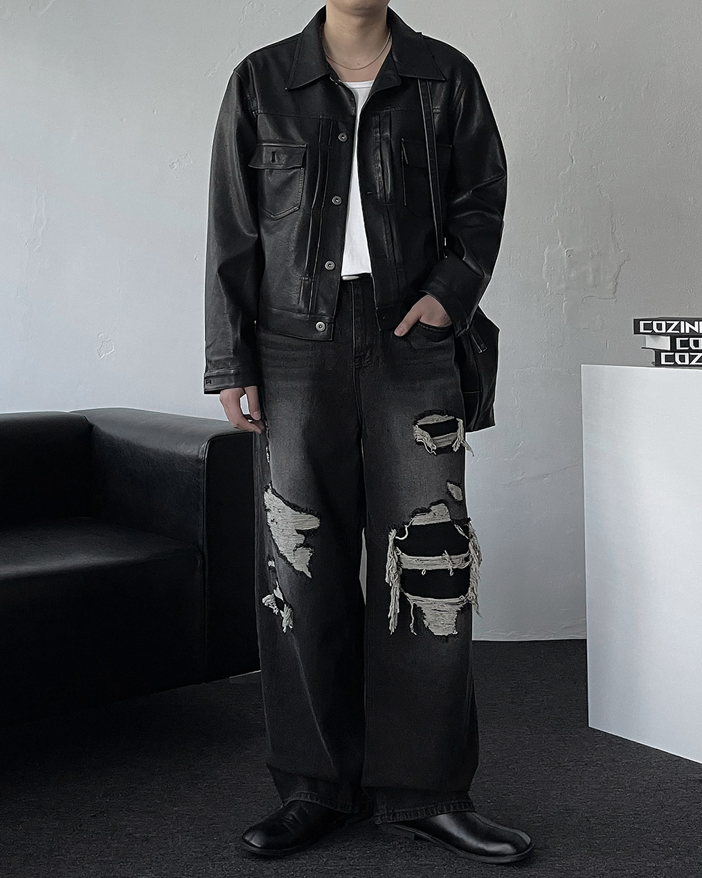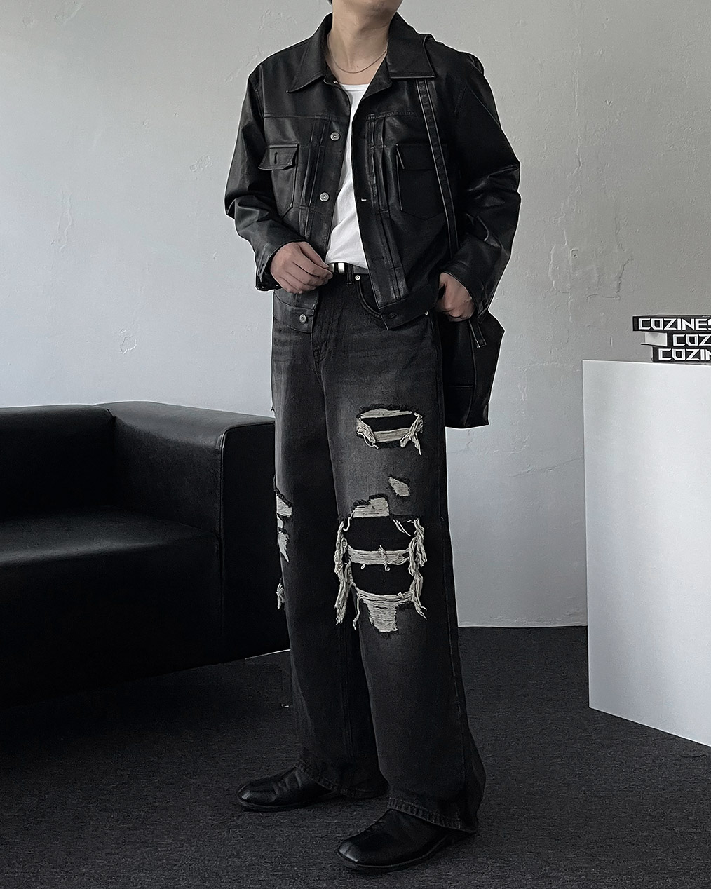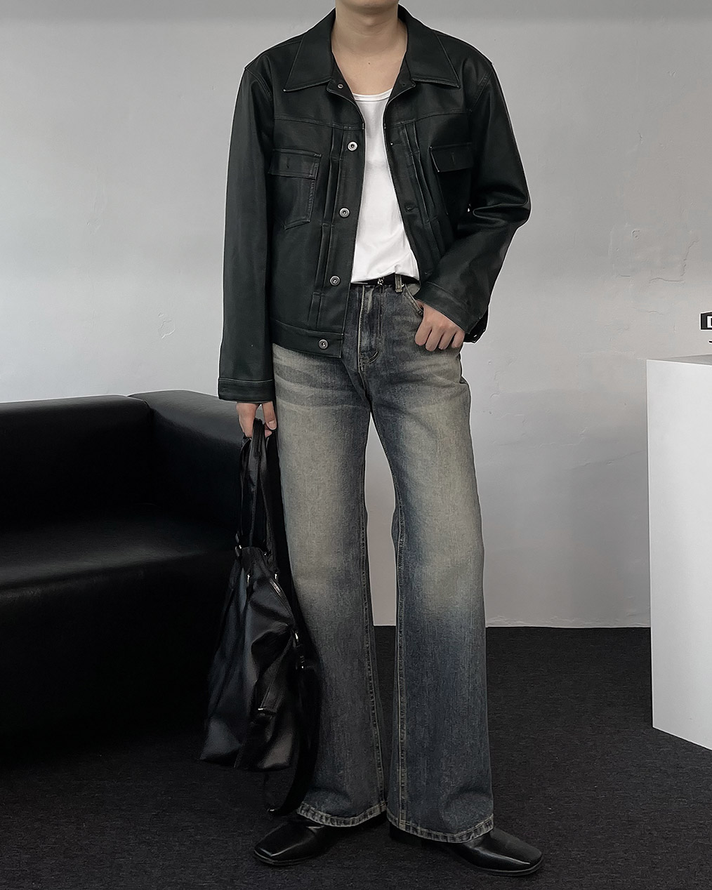 - 트랜디한 핏과 톤 다운된 컬러가 매력적인 레더 트러커 자켓