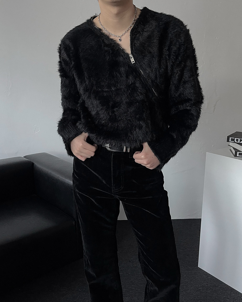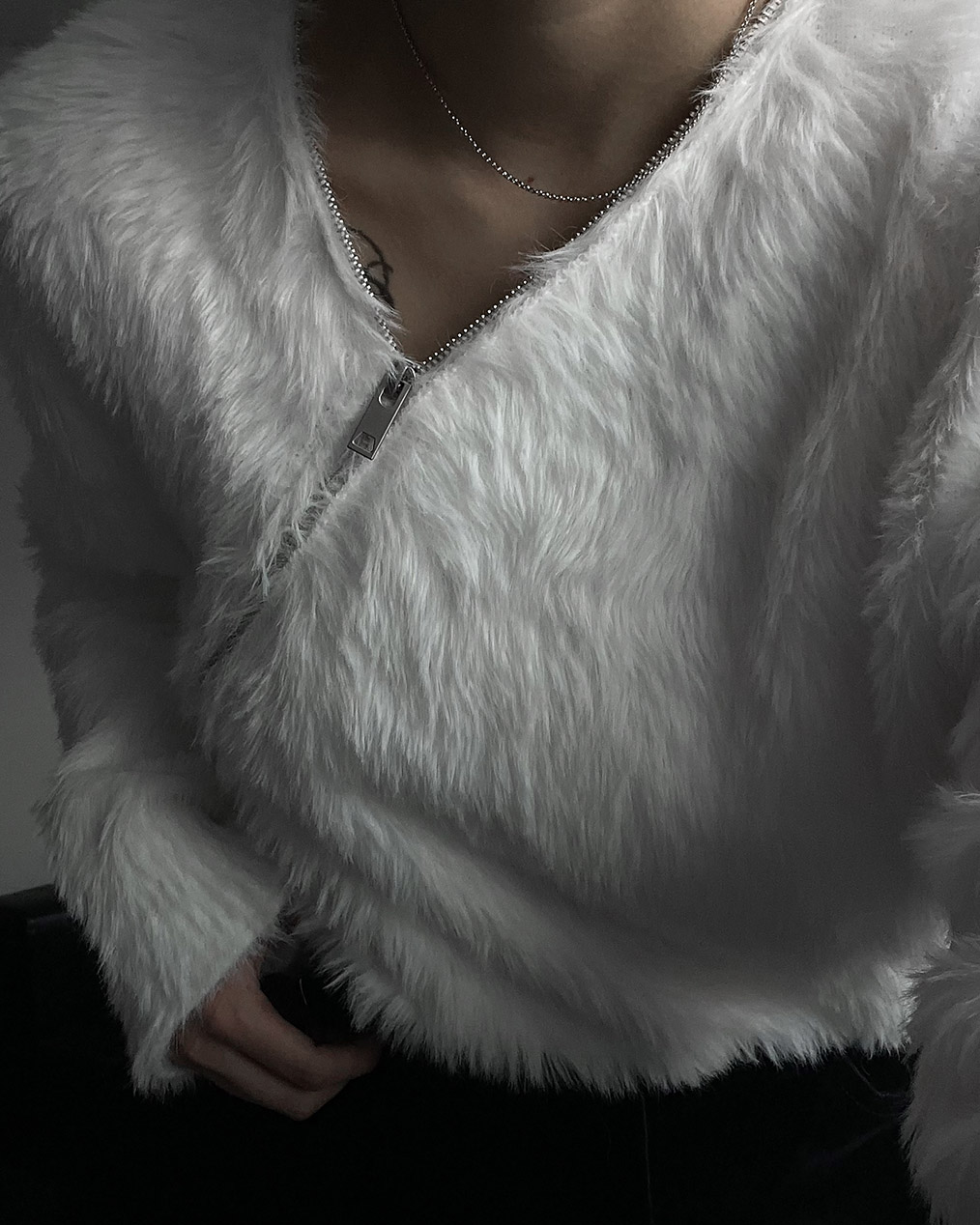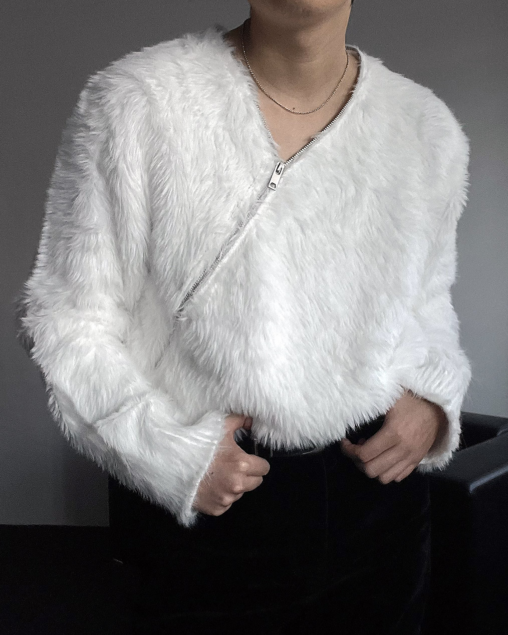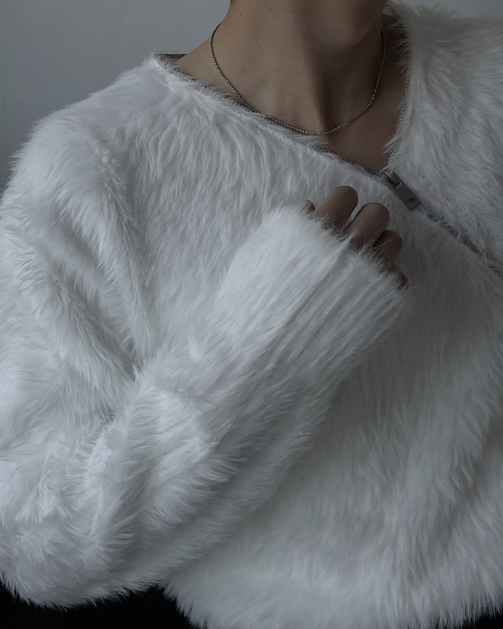 - 넥 라인 사선 지퍼 디테일이 유니크한 앙고라 니트