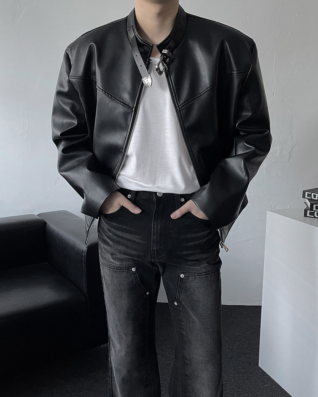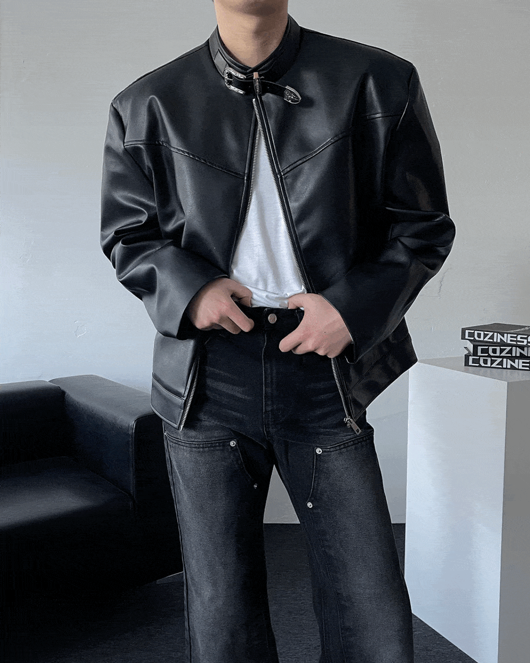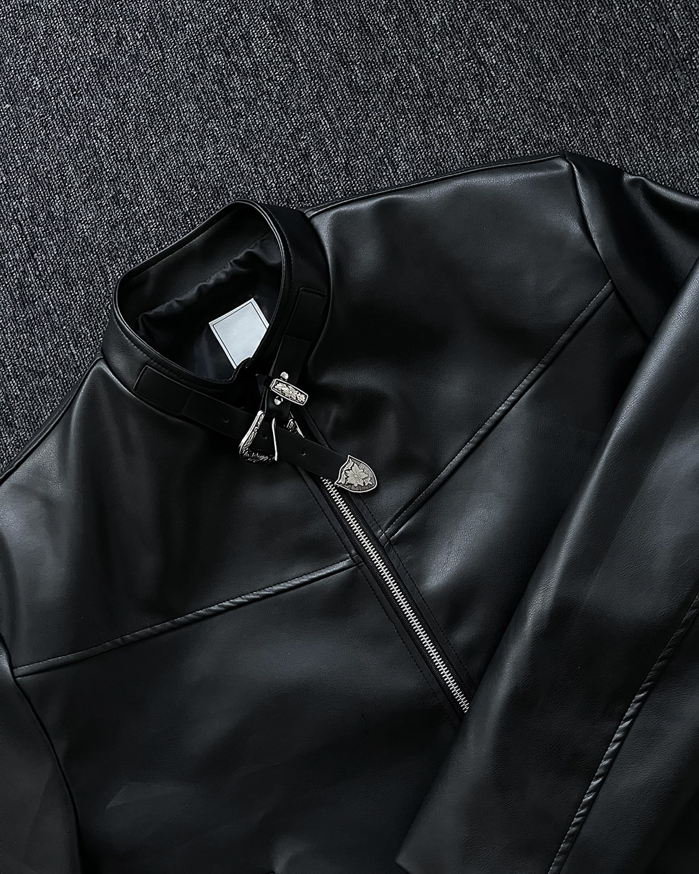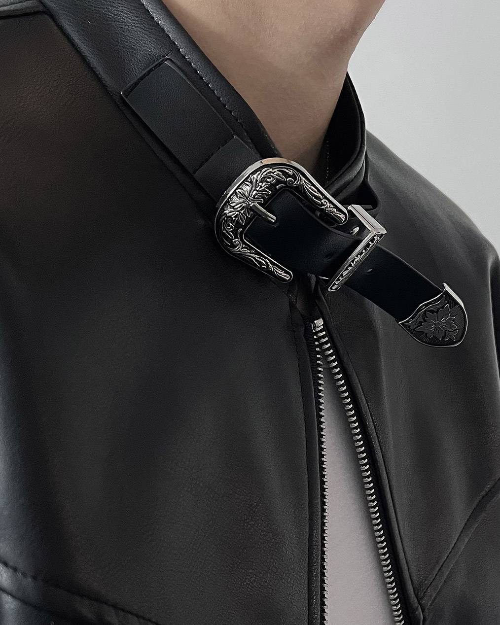 - 웨스턴 벨트 넥 카라 디테일이 유니크한 레더 자켓