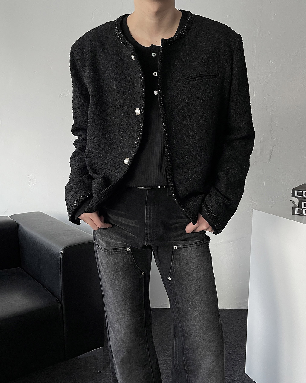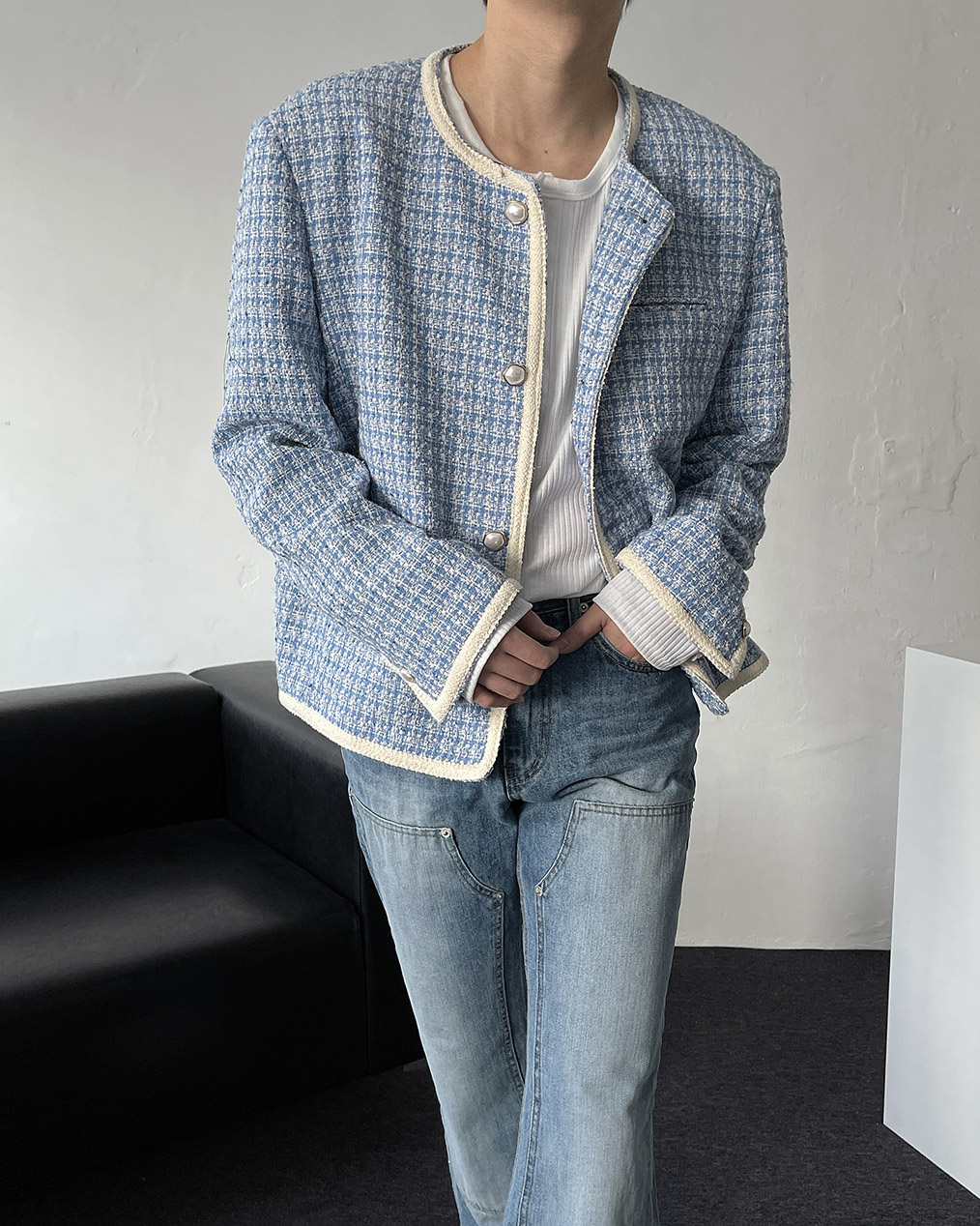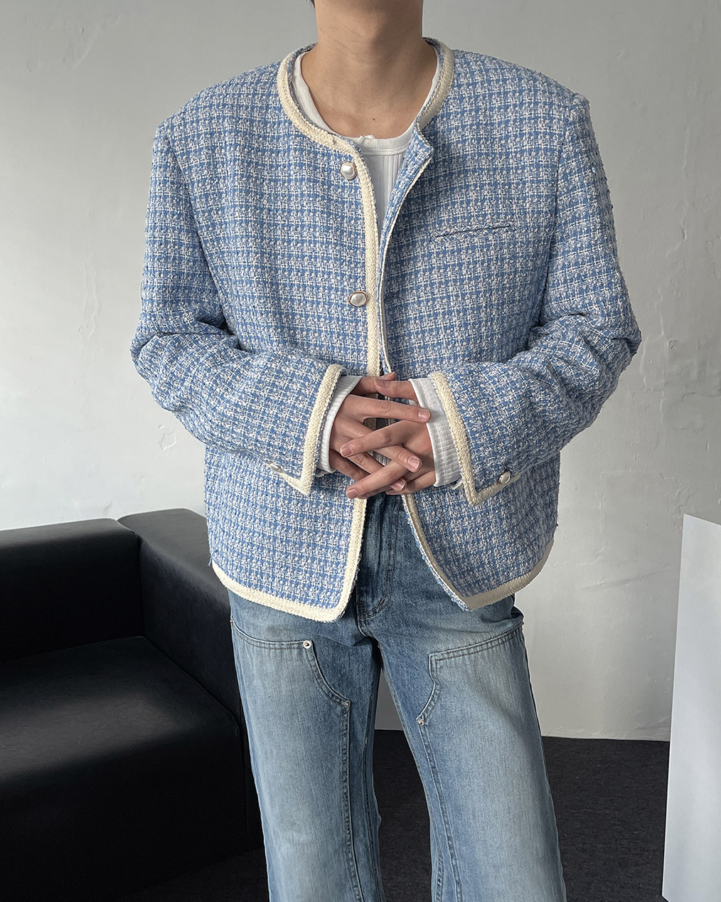 - 브랜드 퀄리티로 제작된 노카라 라운드 트위드 자켓