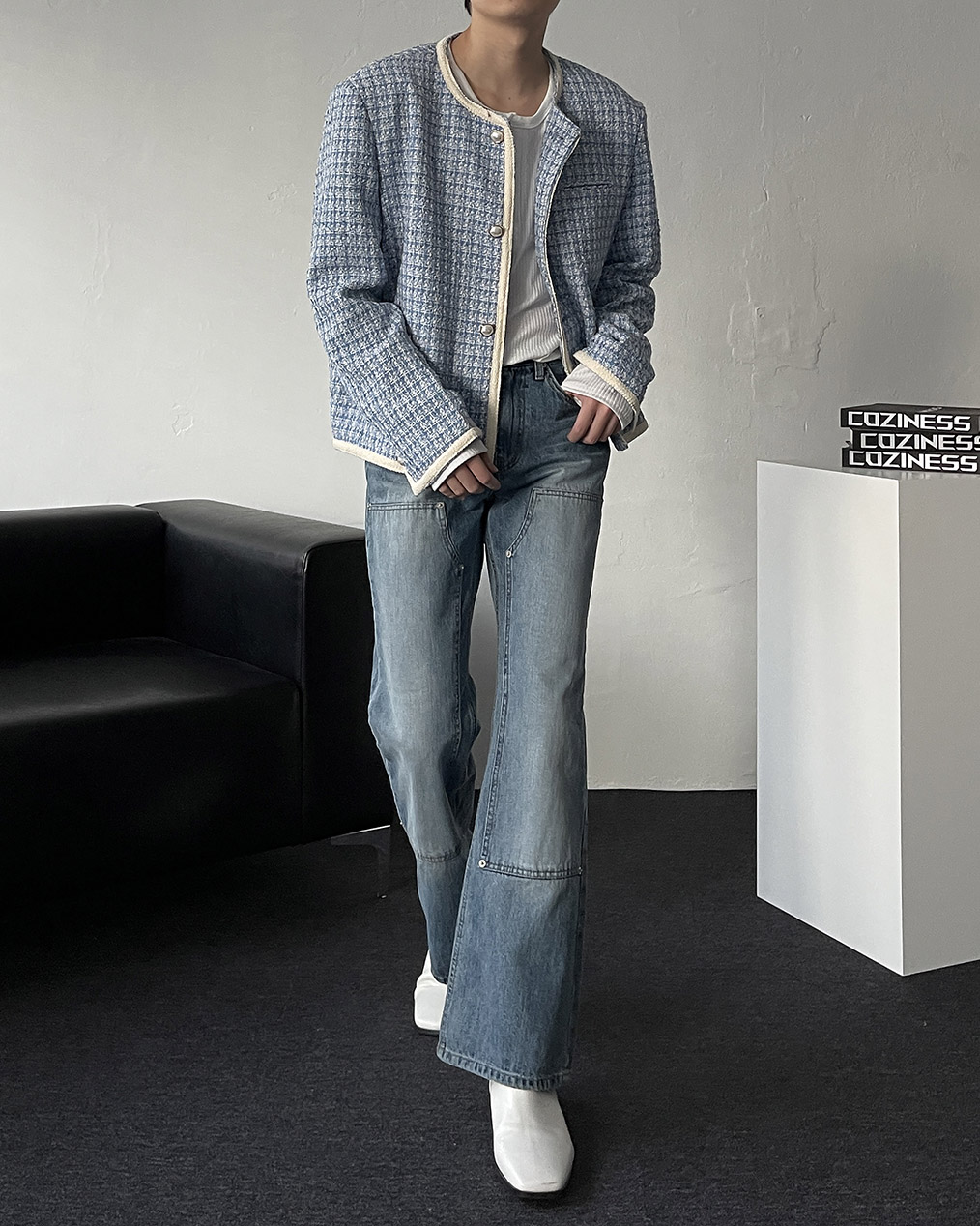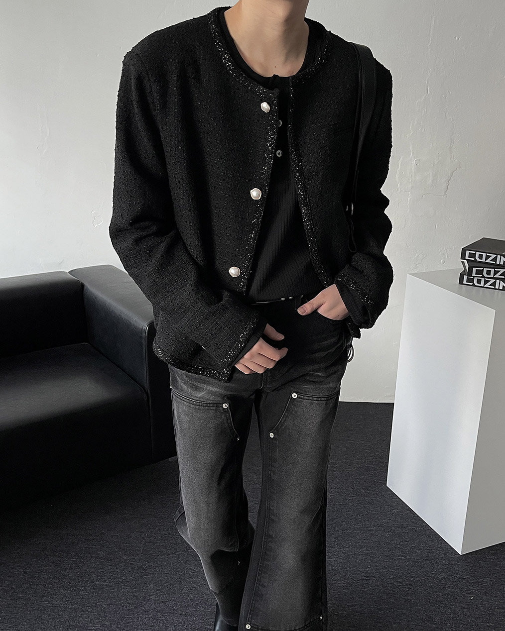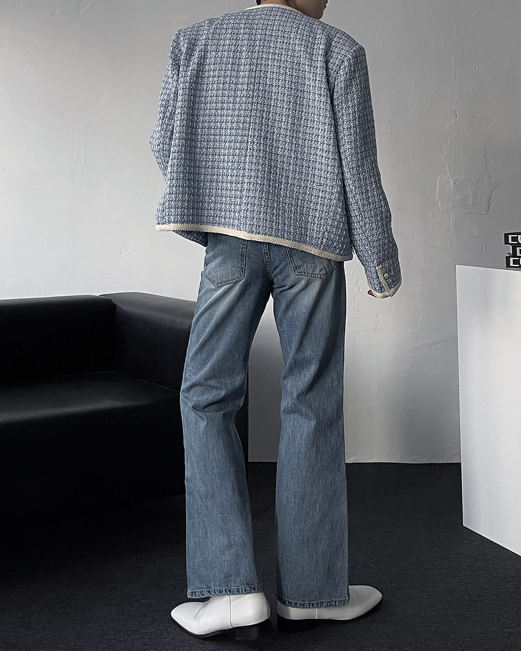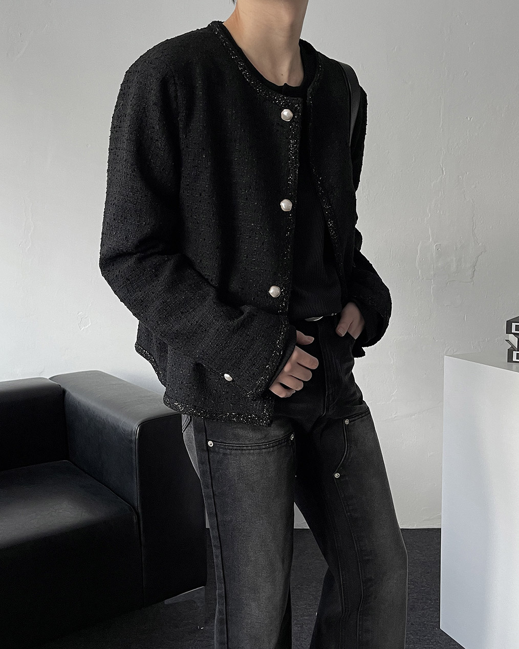 - 브랜드 퀄리티로 제작된 노카라 라운드 트위드 자켓
