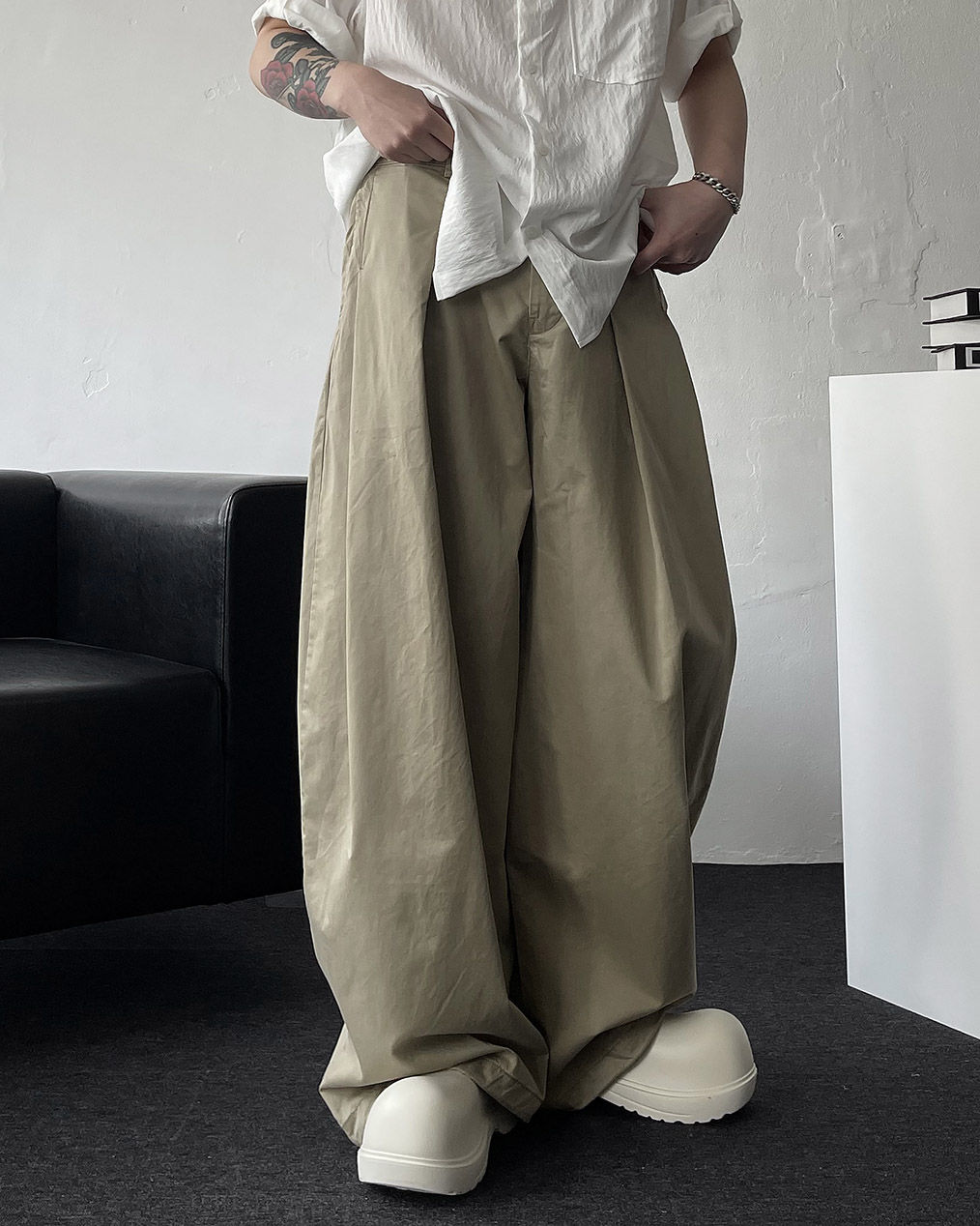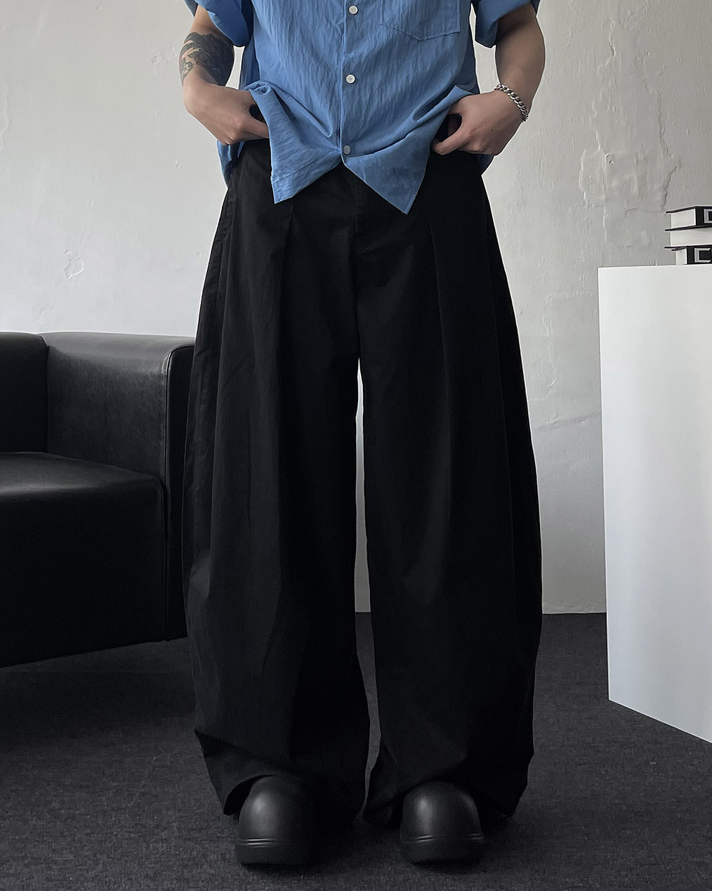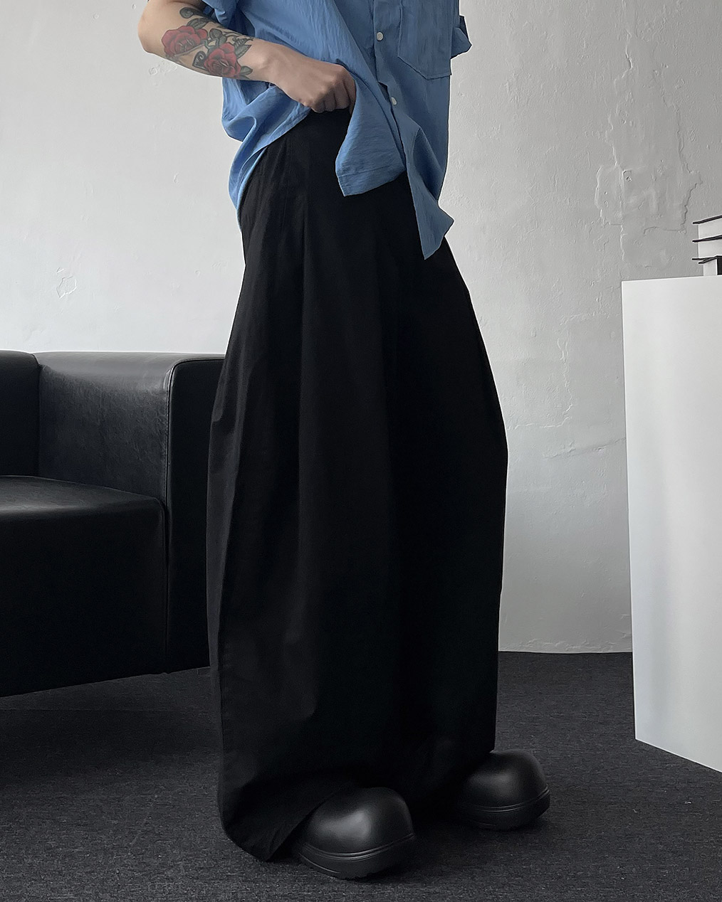 - 롱한 기장, 전면 & 사이드 핀턱이 실루엣을 잡아줌, 밑단 스트링 디테일