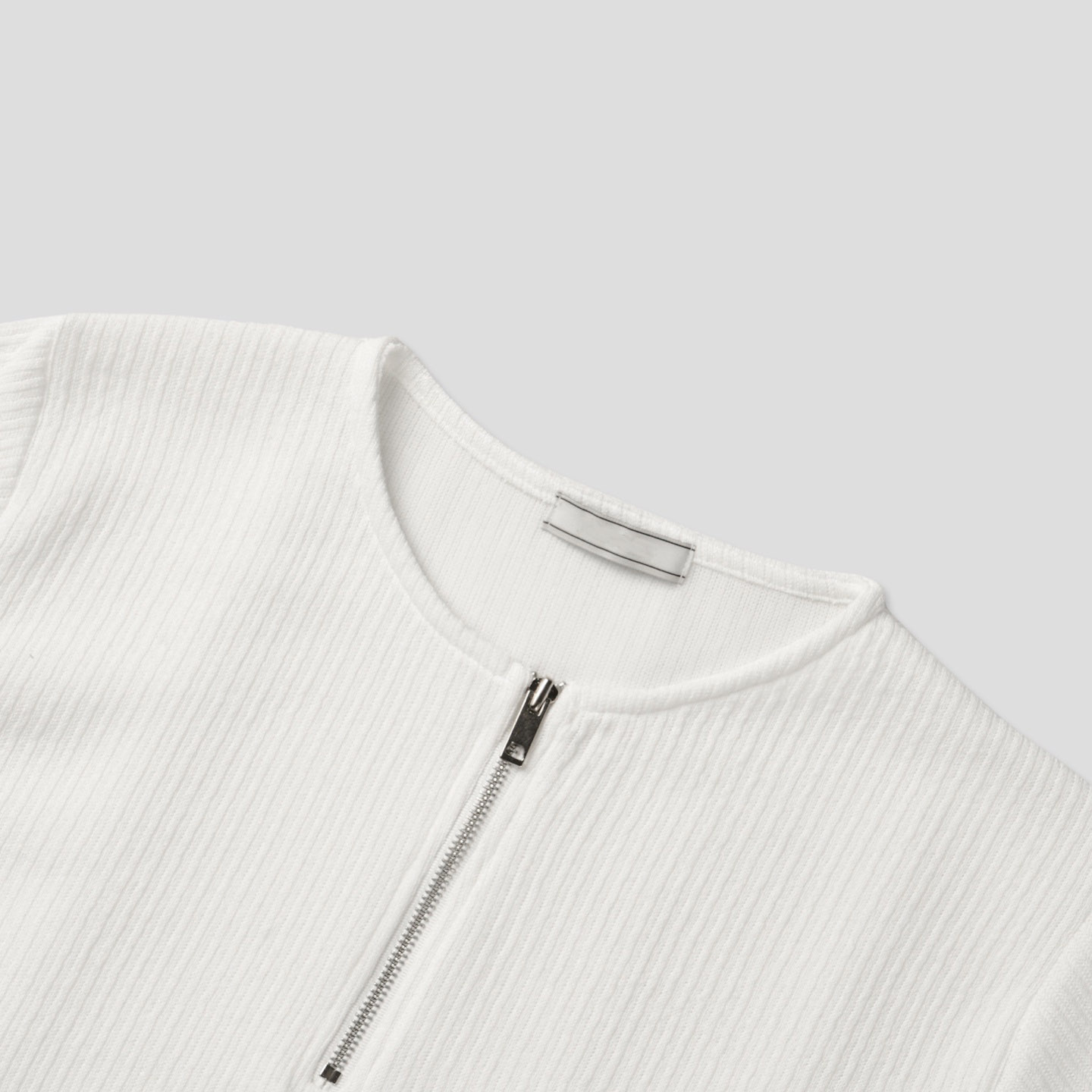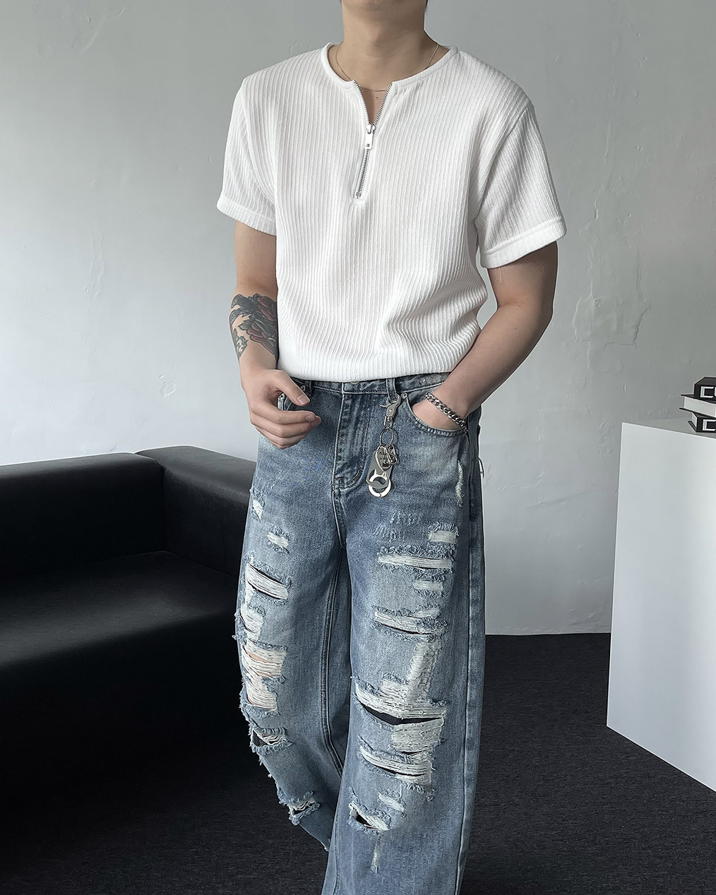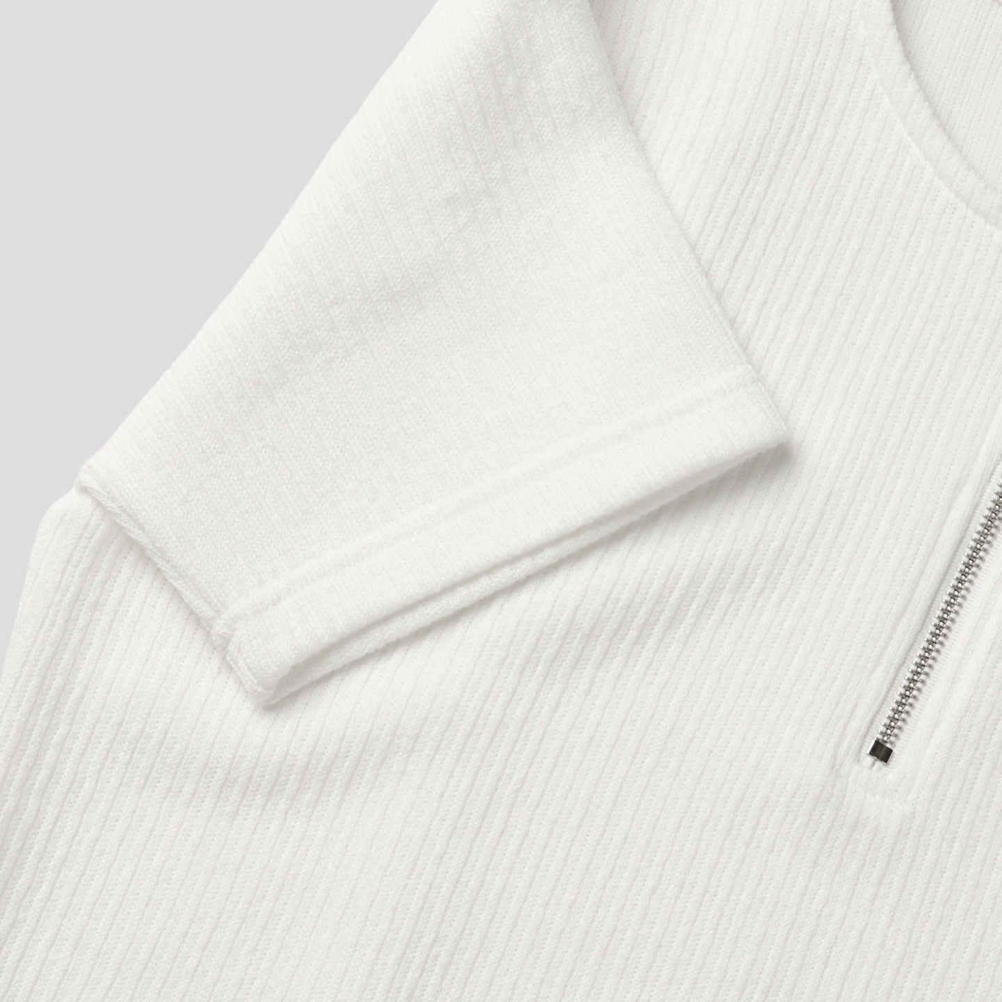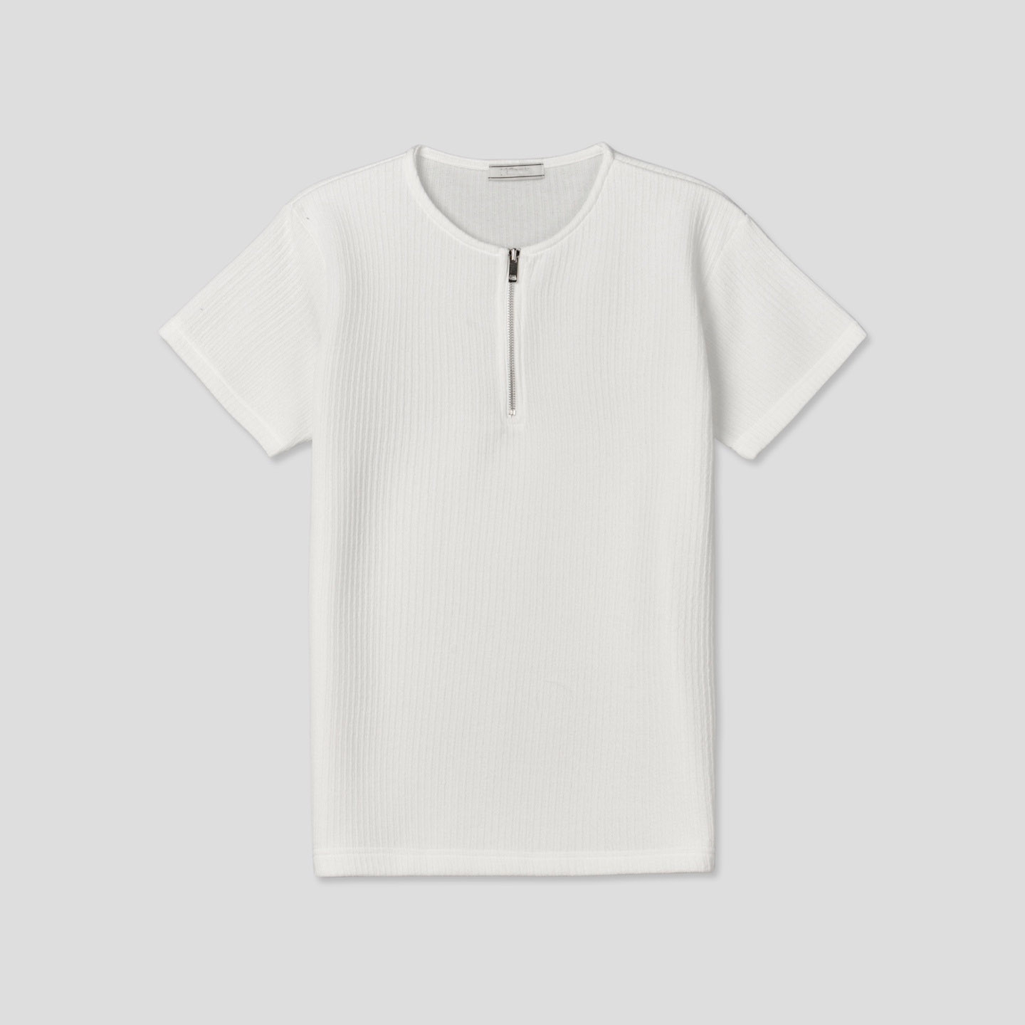 - 트렌디한 무드에 반집업 디테일이 더해진 골지 반팔 티셔츠