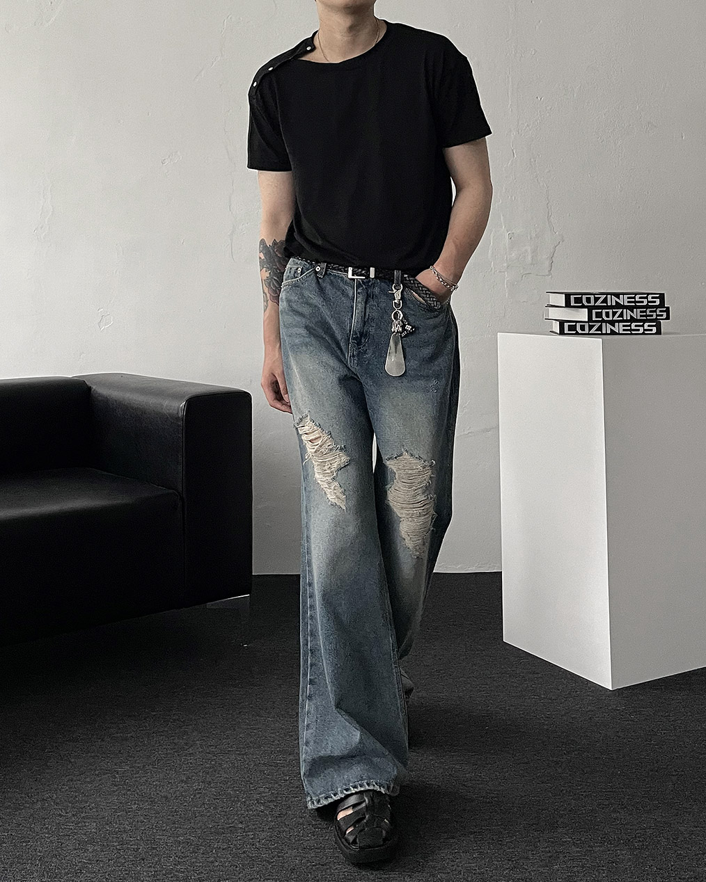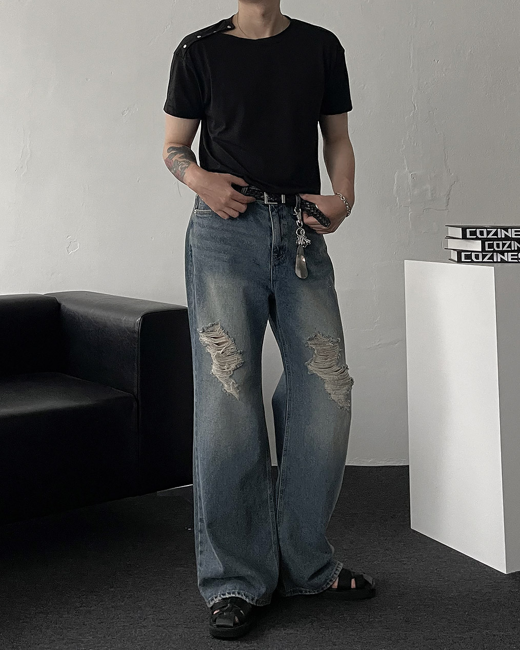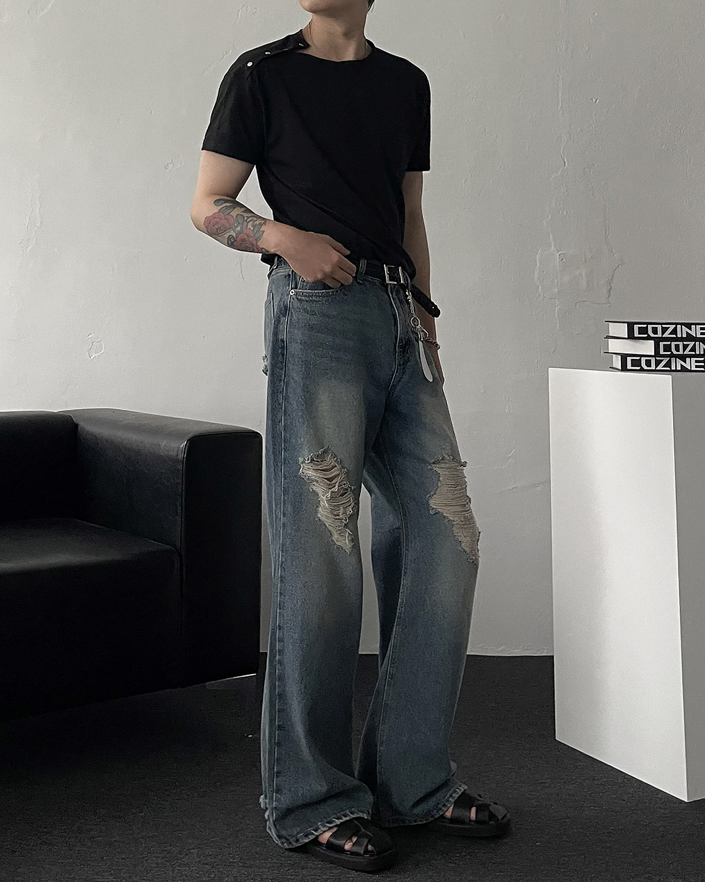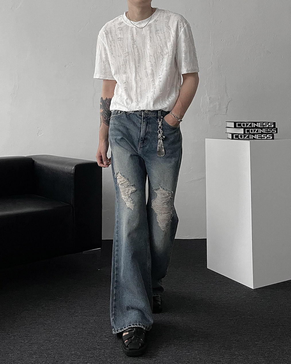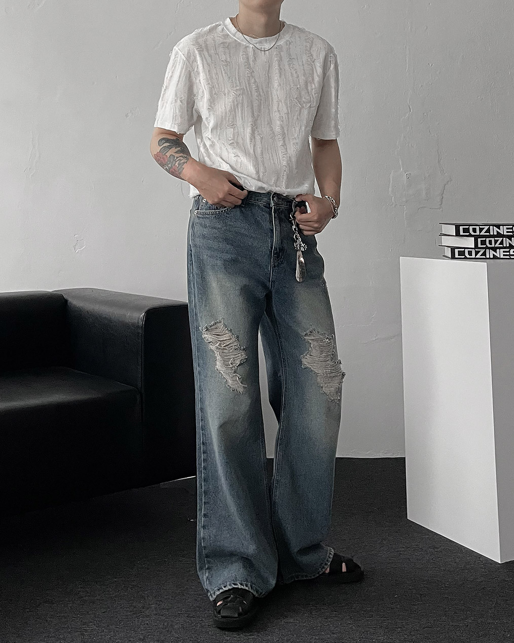 - 전면, 뒷 포켓 & 밑단 하드 데미지 디테일로 유니크한 포인트 완성