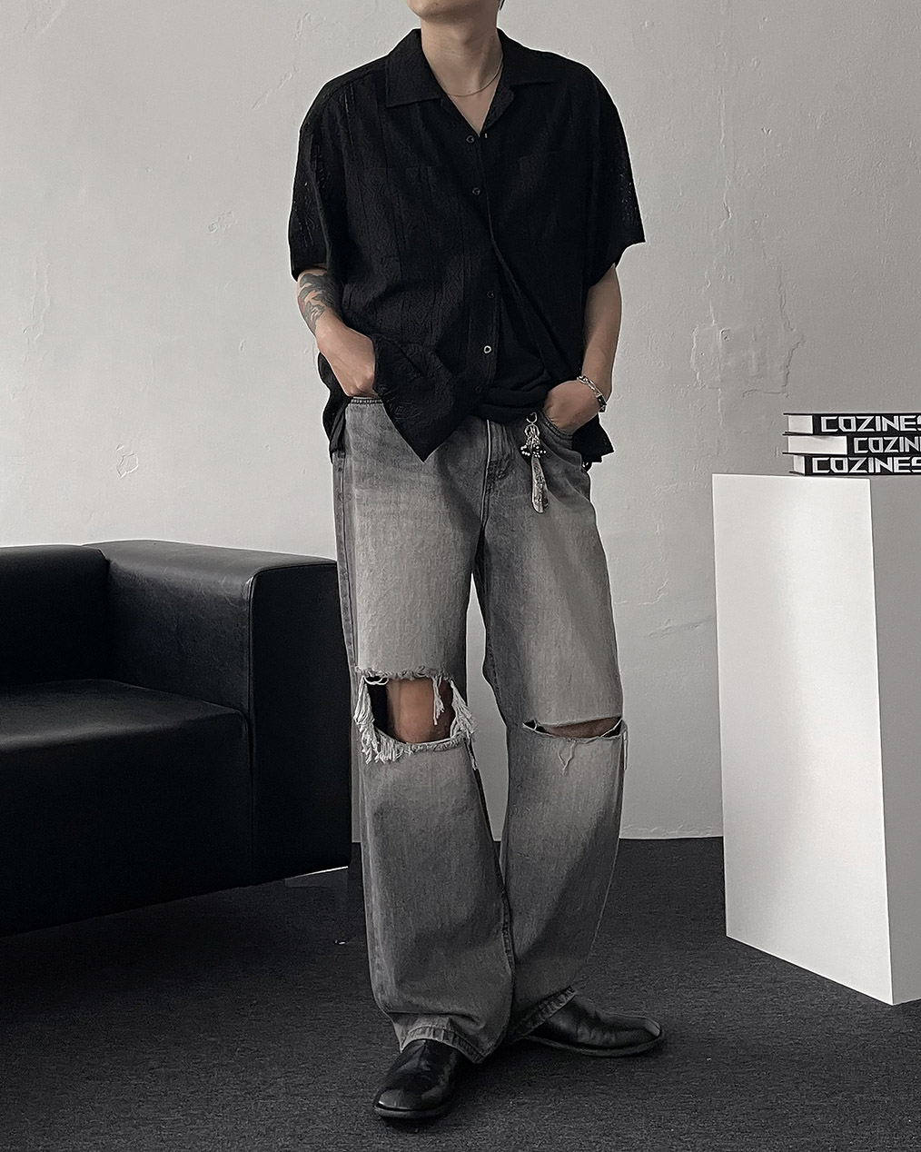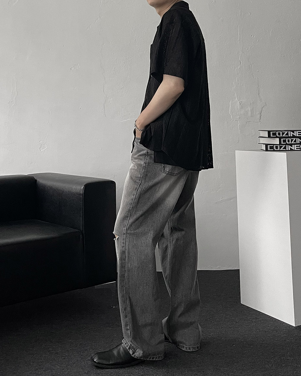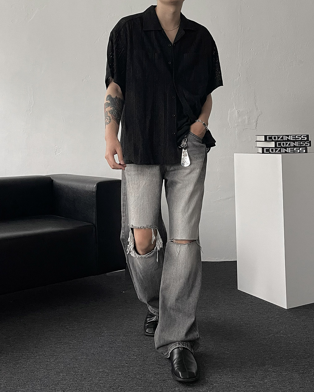- 얇고 가벼운 레이스 오픈 카라 반팔 셔츠