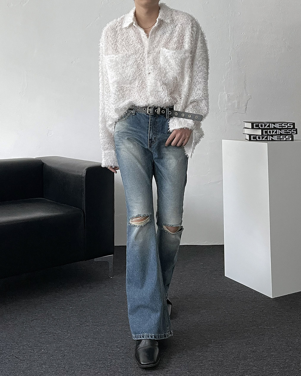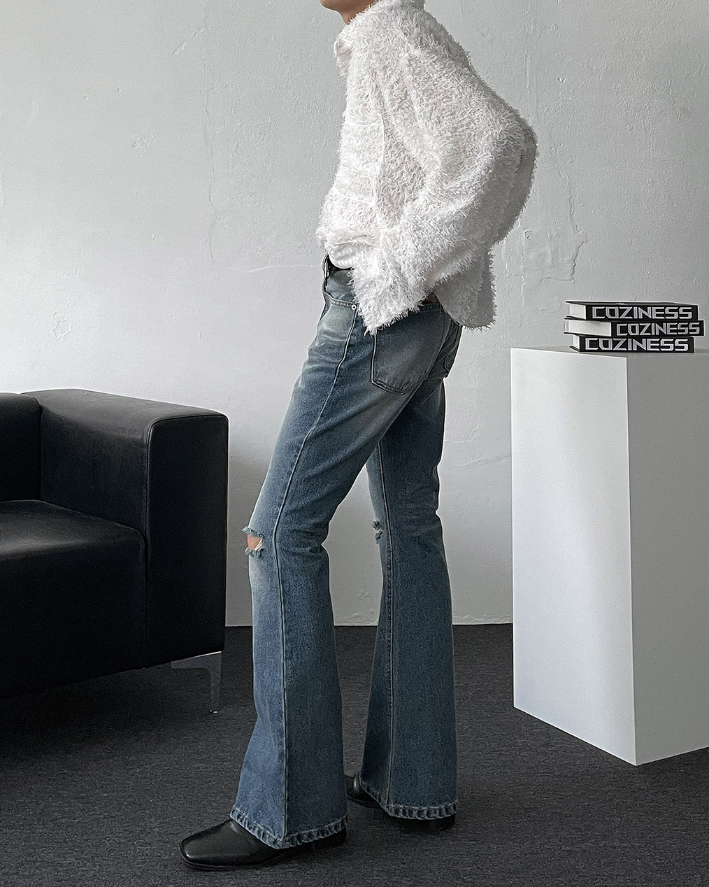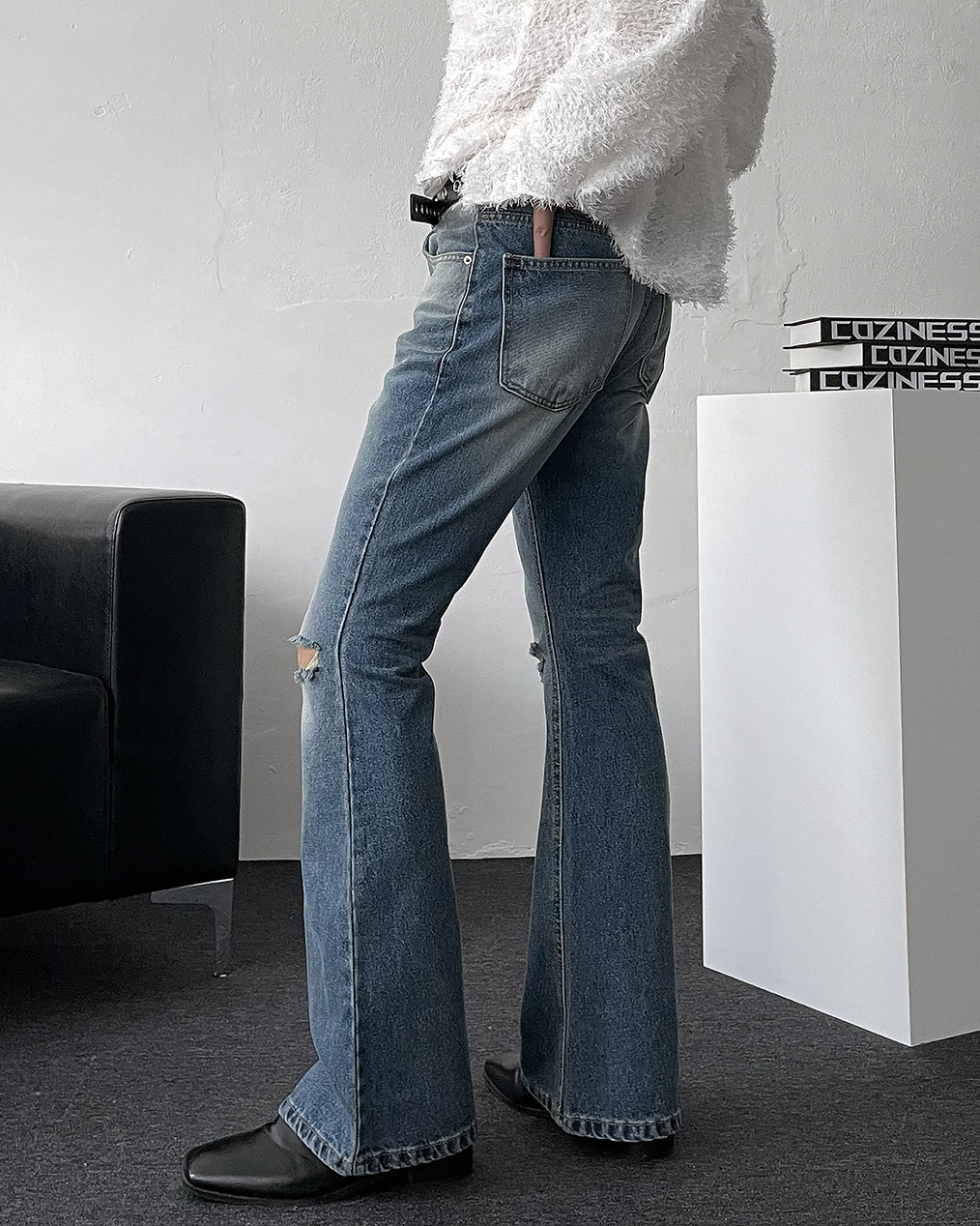 - 양쪽 무릎 컷팅 데미지 디테일이 심플한 상의에도 확실한 포인트