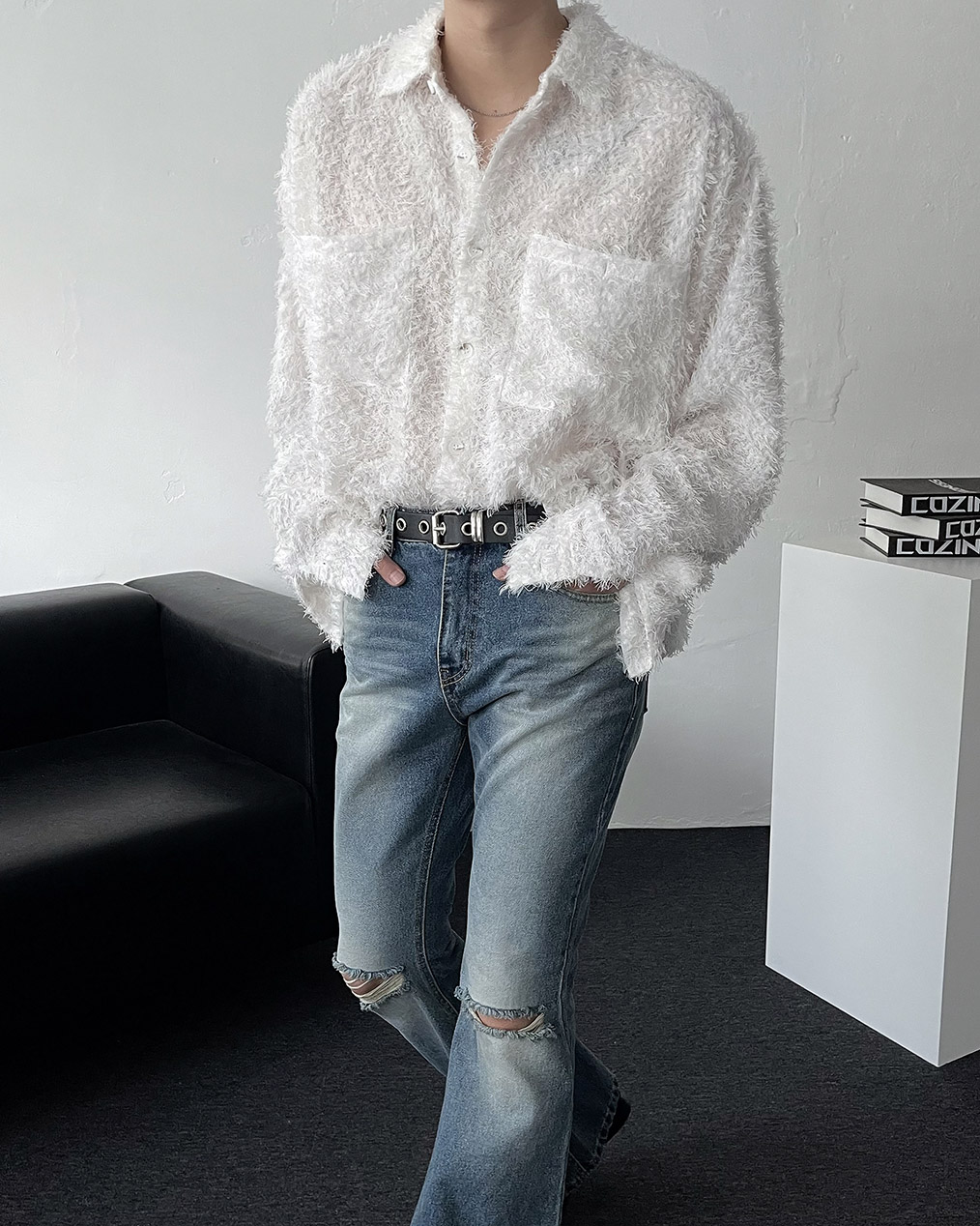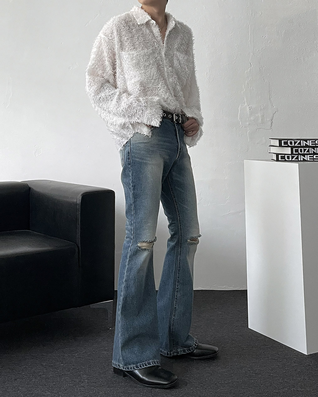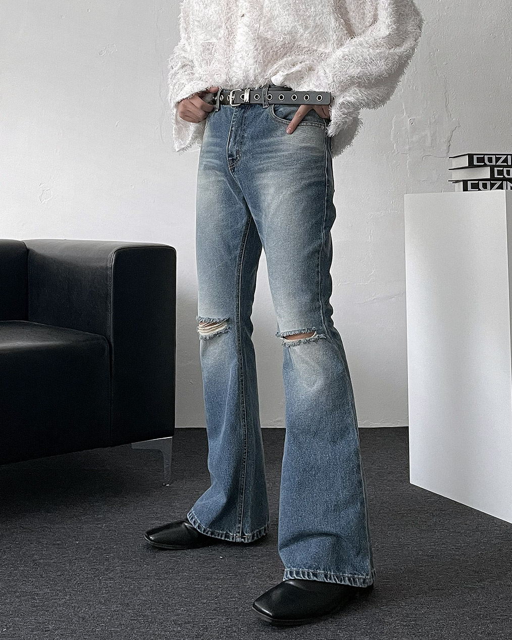 - 양쪽 무릎 컷팅 데미지 디테일이 심플한 상의에도 확실한 포인트